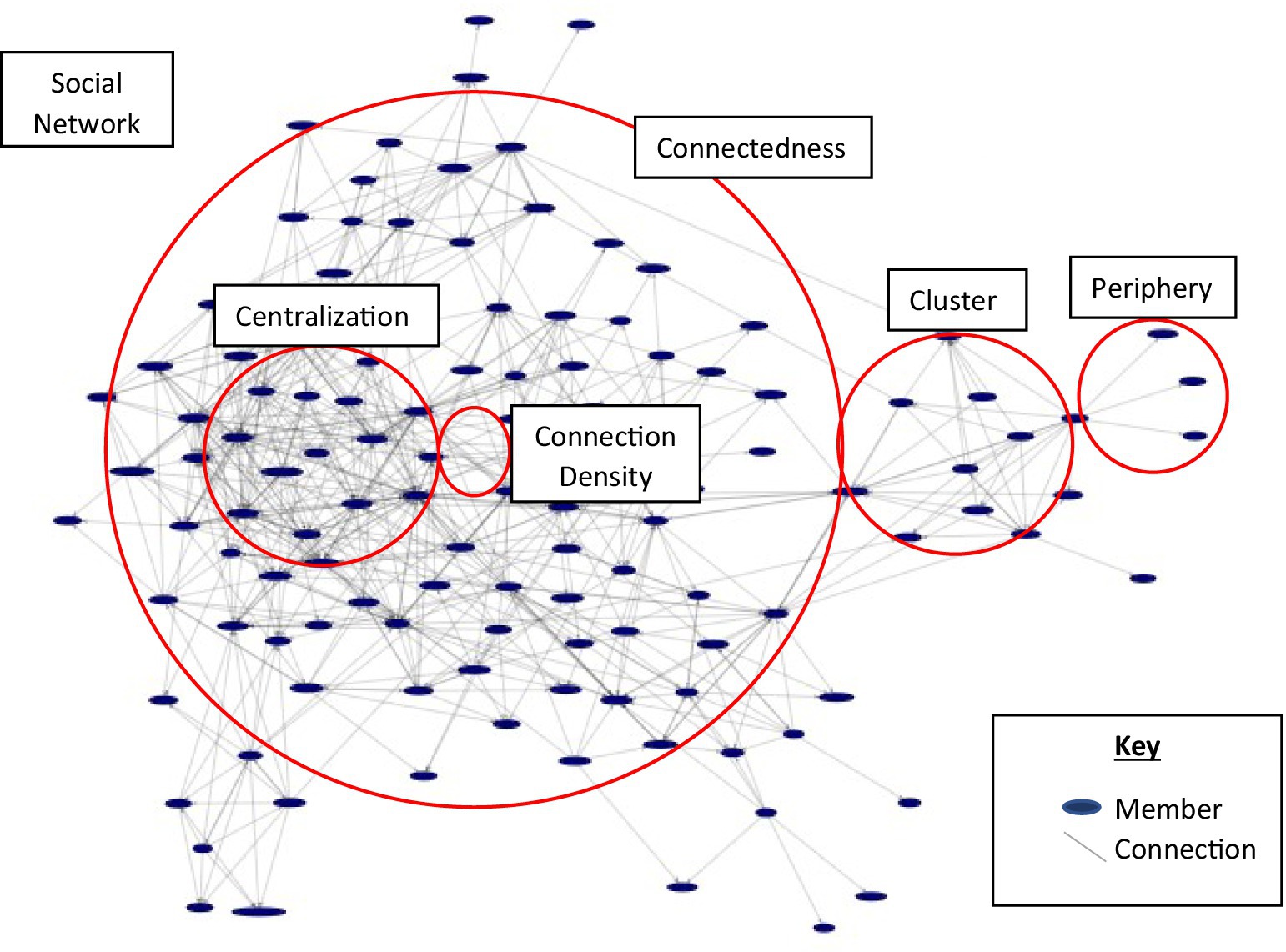 Figure 1. Organizational network example and key terms. Key includes member, which represented an individual person within a network and connection, which represented a relationship that existed between two people within a network. Definitions include Social network or social network analysis (SNA) is defined by the measuring of individuals who exist within a population (such as a group, organization, or community) and the relationships they hold with each other; Cluster or group is described as the closeknit and often interwoven relationships that occur within a population subgroup; Centralization or centrality is described by the degree to which groups display power dynamics, such as through hierarchies; Connection density is defined as the total number of connections that exist within a network out of the total possible number of connections; Connectedness described the overall proximity of relationships that exist within a group; Periphery is defined by the far ends or silos of a network that are farthest from the center; and Internal and external collaboration, which are defined by the presence of network relationships that promote network expansion and that exist within and outside of a network, respectively.