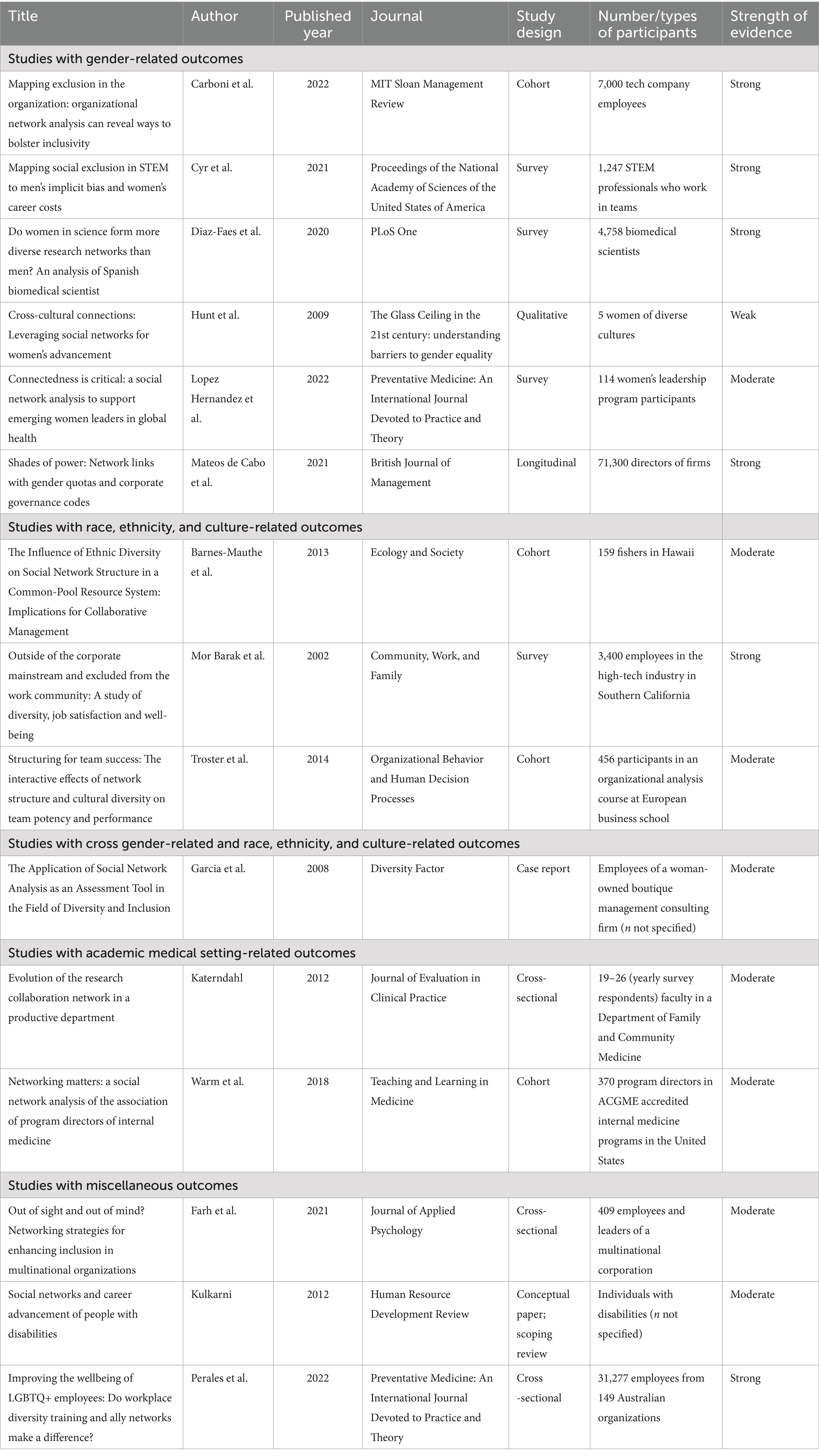 Understanding the complexities and nuances of organizational networks is vital to fostering workplace inclusion and belonging. The majority of articles included in this review focused on gender-related outcomes, while others included outcomes related to race, ethnicity, and culture, academic medical centers, employees of a multinational organization, individuals with disabilities, and LGBTQ employees.