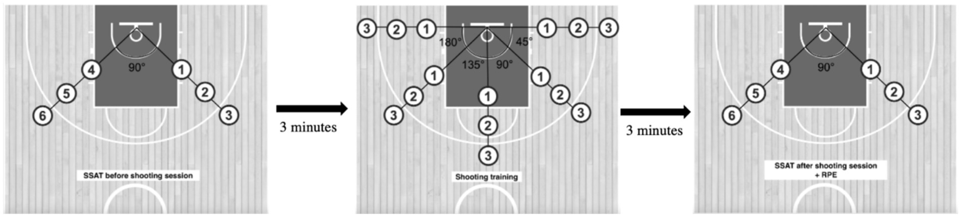 The training intervention spanned 8 weeks and was delivered during the regular basketball season. Participants completed two on-court training sessions per week as part of the experimental protocol. In each session, DT was implemented immediately following a standardized warm-up routine. Each DT session consisted of a single set of 30 shots executed from five court angles: 0°, 45°, 90°, 135°, and 180°. At each angle, participants attempted six shots, two from each of three fixed distances: 3.90 m (Position 1), 5.30 m (Position 2), and 6.75 m (Position 3). Each shot was performed under a distinct constraint designed to introduce movement variability and task-specific perturbation (Figure 1; Table 1). Both DTG and TTG sessions were preceded by the SSAT, administered 3 min before training. Sessions concluded with the 30-shot protocol, an assessment of RPE, and a second SSAT conducted 3 min post-intervention (Figure 1). Prior to each DT session, participants received verbal instructions from the lead investigator specifying the movement variation to be applied. These variations were grounded in the theoretical principles of the DL model for motor skill acquisition (Schöllhorn et al., 2012; Oftadeh et al., 2021). The TT protocol was structurally matched to the DT condition in terms of volume, shot distribution, and spatial configuration but was performed without imposed variability. All shots in the TT condition were executed with a standard size 6 basketball, under consistent and repetition-based constraints. Outside the intervention, both groups maintained their regular basketball training schedules. Each session lasted approximately 90 min and included 30 min of technical skill instruction followed by 30 min of continuous full-court (5v5) gameplay. These sessions were conducted independently of the experimental intervention. On non-intervention days, both groups participated in one 90-min basketball training session per week. Each session consisted of 15-min warm-up, 20 min of small-sided games (1v1, 2v2, and 3v3), 25 min of technical skill instruction, and 30 min of full-court (5v5) gameplay. The training structure and workload were standardized and consistently implemented across both groups. Two weeks after the post-test, all subjects participated in the retention tests.
