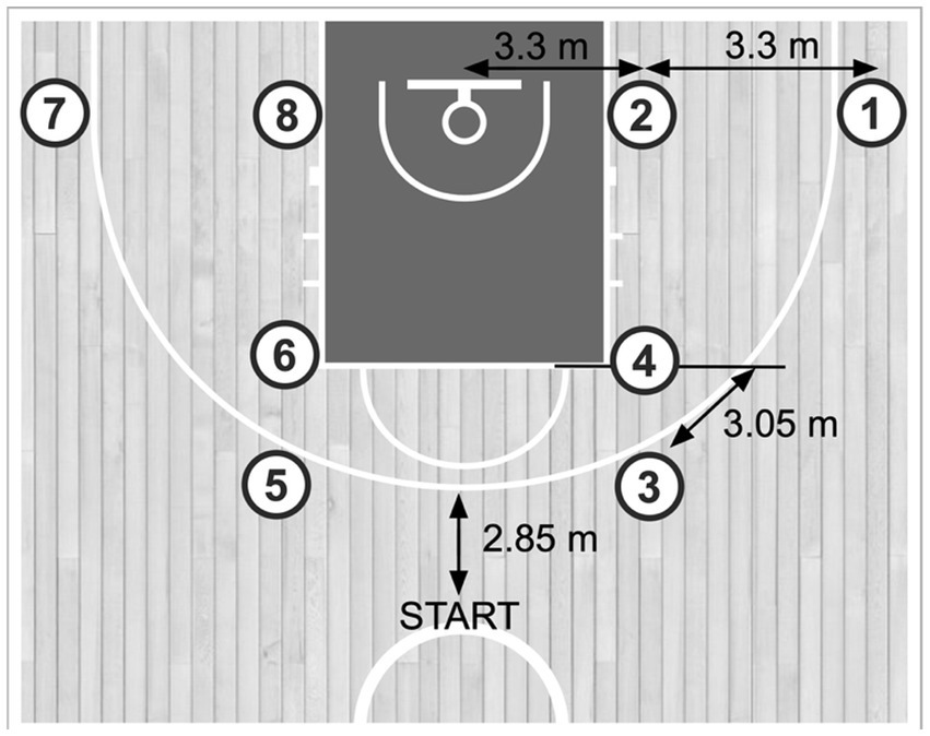 To evaluate the acute effects of DT on shooting performance, a modified version of the SSAT was employed, based on the protocol established by Pojskic et al. (2018). After completing the standardized warm-up, each participant executed two jump shots from six predetermined court locations, resulting in a total of 12 attempts (Figure 1). The shooting sequence began at the right wing, designated as Position 1. The six positions were spaced across three diagonal distances from the basket: 3.90 m (Positions 1 and 4), 5.30 m (Positions 2 and 5), and 6.75 m (Positions 3 and 6). Participants were allowed unlimited time to complete their attempts; however, standardized verbal cues were used to encourage prompt transitions between positions. Two additional players assisted during the test by retrieving rebounds and returning the ball to the shooter. Shooting performance was assessed by recording the total number of successful shots made during the trial. SSAT tallies (made/missed) were recorded on court using standardized forms; assessors were not blinded to allocation, which we mitigate by using an objective binary outcome and fixed test order.