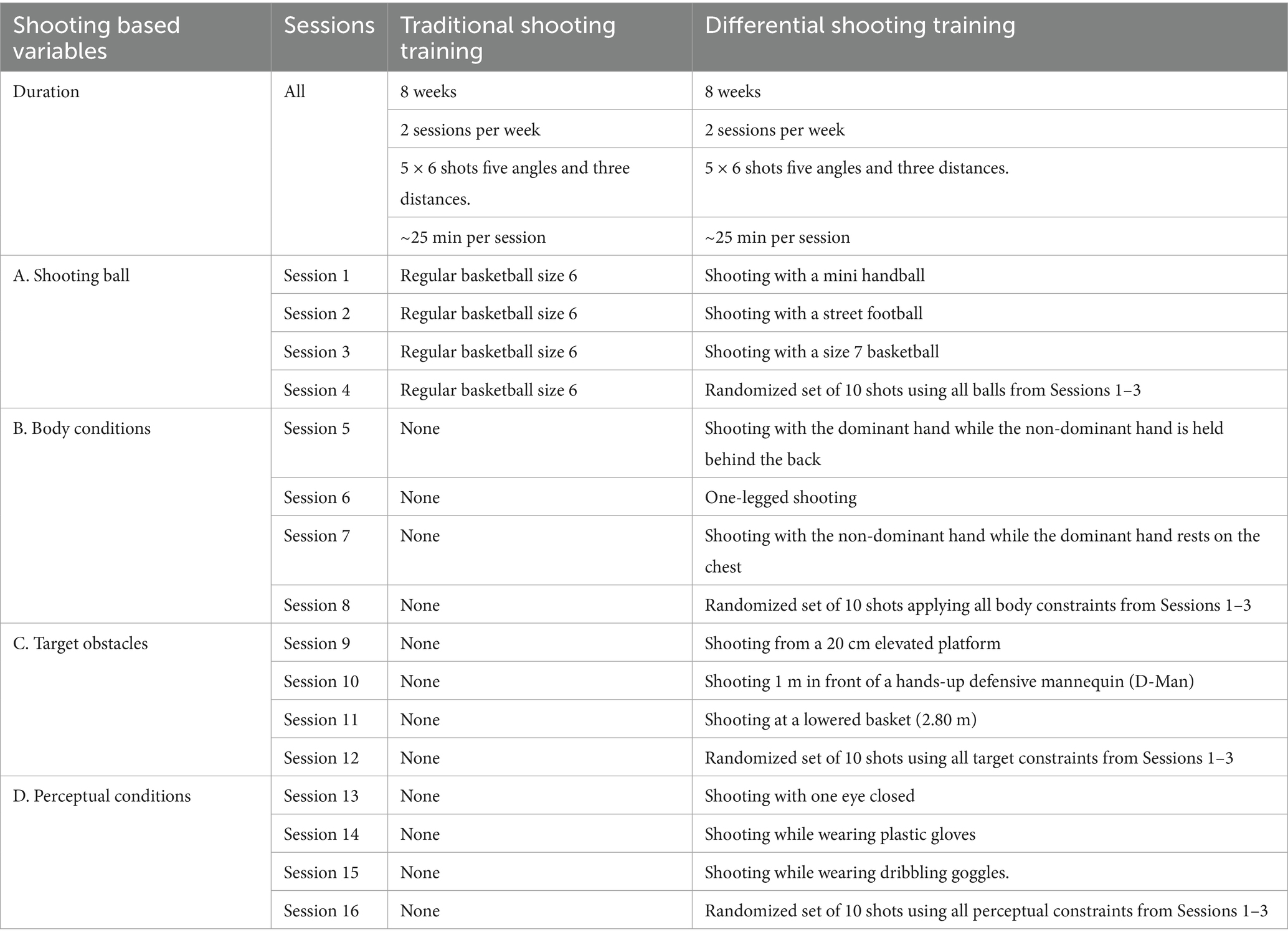 Basketball is distinct from other sports due to its high scoring frequency, the requirement of ball dribbling, and its emphasis on verticality, particularly jumping ability. Research examining the application of DL in basketball remains limited. To date, only a limited number of studies have evaluated its impact on basketball-specific technique training (Poureghbali et al., 2020; Schönherr and Schöllhorn, 2003). In a pre-post-test design, a repetition-based group of youth basketball players was compared with a differentially training group of similar age (Poureghbali et al., 2020). Both groups trained once a week for 30 min basketball free throw according to the group conditions. The posttest showed a highly significant higher performance improvement than the classically training group. In another investigation (Schönherr and Schöllhorn, 2003), players participated in small-sided games (SSGs) incorporating varied numerical player configurations during tasks. This intervention was associated with increased dribbling frequency and a reduced spatial exploration index, outcomes interpreted as indicative of enhanced decision-making under dynamic, game-like conditions (Schönherr and Schöllhorn, 2003). Although the initial results are promising, the study presents several methodological limitations. The sample size was small (n = 8), the intervention lasted only 4 weeks, and the protocol did not address precision-dependent skills, such as basketball shooting. While current evidence suggests potential benefits of DL in basketball contexts, further methodologically rigorous studies are needed. Future research should extend intervention durations and incorporate a broader spectrum of task constraints to more comprehensively assess DL’s efficacy, particularly in improving shooting performance.