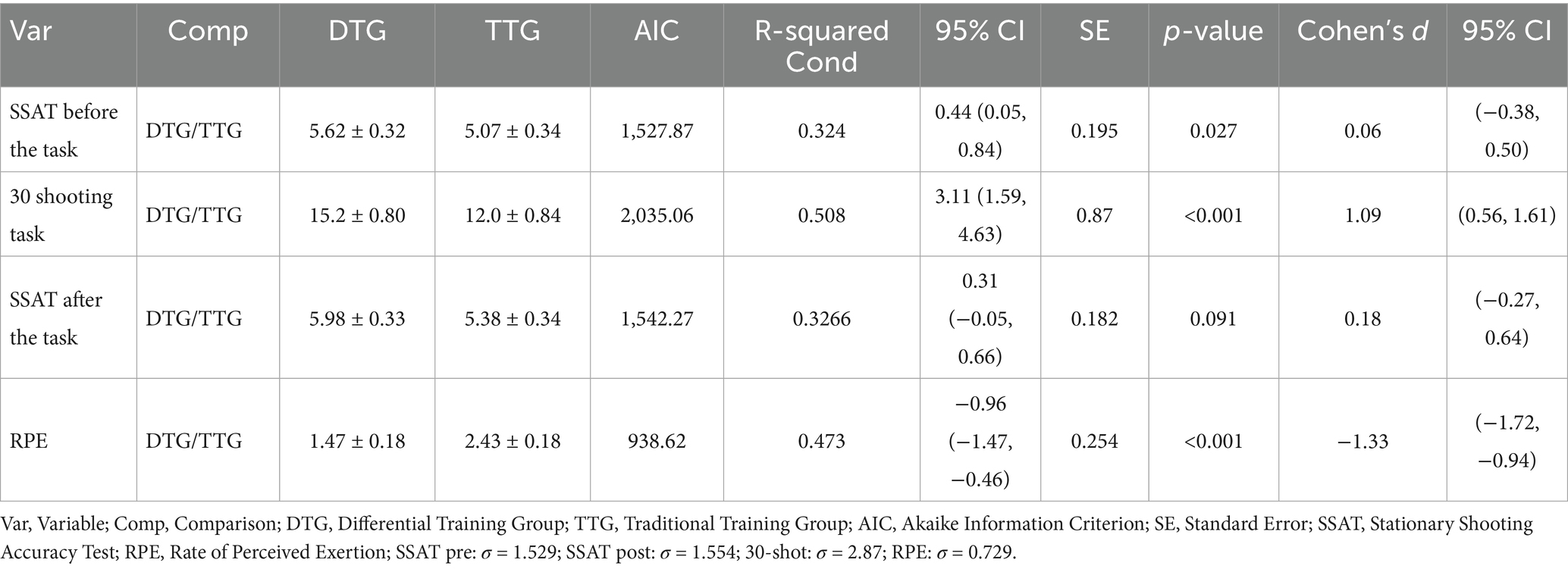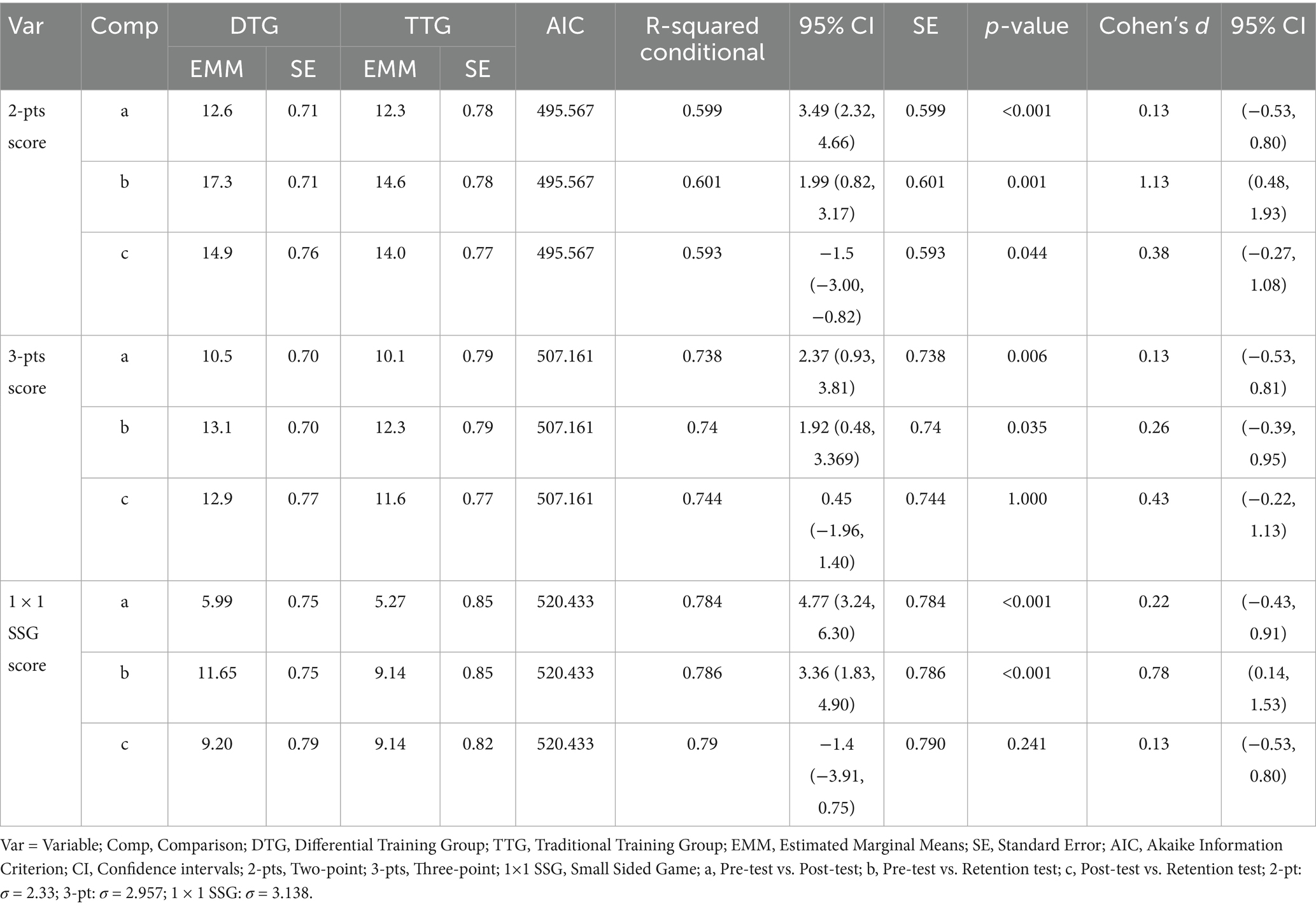 Descriptive statistics (mean ± SD) were computed for all variables. For the longitudinal outcomes—BJSAT two-point score, BJSAT three-point score, and 1 × 1 SSG scoring—we fitted linear mixed models (LMMs) with Group (DTG, TTG), Time (pre, post, retention; categorical), and the Group × Time interaction as fixed effects, and Participant as a random intercept to account for within-subject dependence. The Gaussian family with identity link was used. Models were estimated by restricted maximum likelihood (REML). Planned contrasts were specified on the Time factor (and its interaction) to test pre → post, pre → retention, and post → retention comparisons; in the tables these are denoted a, b, and c, respectively (inter-group estimates in Table 3; intra-group estimates in Table 4). When reporting between-group differences at a given time point, we used the estimated marginal means from the fitted Group × Time model. 95% confidence intervals and p-values are reported for all tests. For RPE, an LMM was fitted with Group (DTG, TTG), Session (1–16; categorical), and Condition (A–D; categorical) as fixed effects and Participant as a random intercept; Group × Session and Group × Condition interactions were inspected and retained only if significant. For SSAT (before/after within session) and the 30-shot task, separate LMMs compared groups with Participant as a random intercept and included Session as a fixed effect when appropriate. For each DTG–TTG comparison we computed Cohen’s d by standardizing the model-estimated contrast with the residual SD (σ) from the fitted mixed model; 95% CIs for d were obtained by standardizing the contrast CI limits. All mixed models were fitted by REML using all available observations under a Missing at Random assumption. Model assumptions were checked via residual-versus-fitted, Q–Q, and scale–location plots, and by influence diagnostics. Where near-singular fits occurred, we repeated the analysis with a random-intercept–only specification; Statistical significance was set at α = 0.05. Analyses were conducted in Jamovi (v1.2.27).