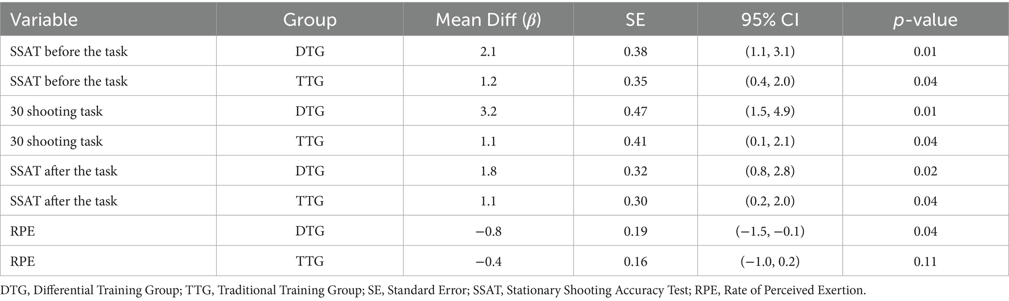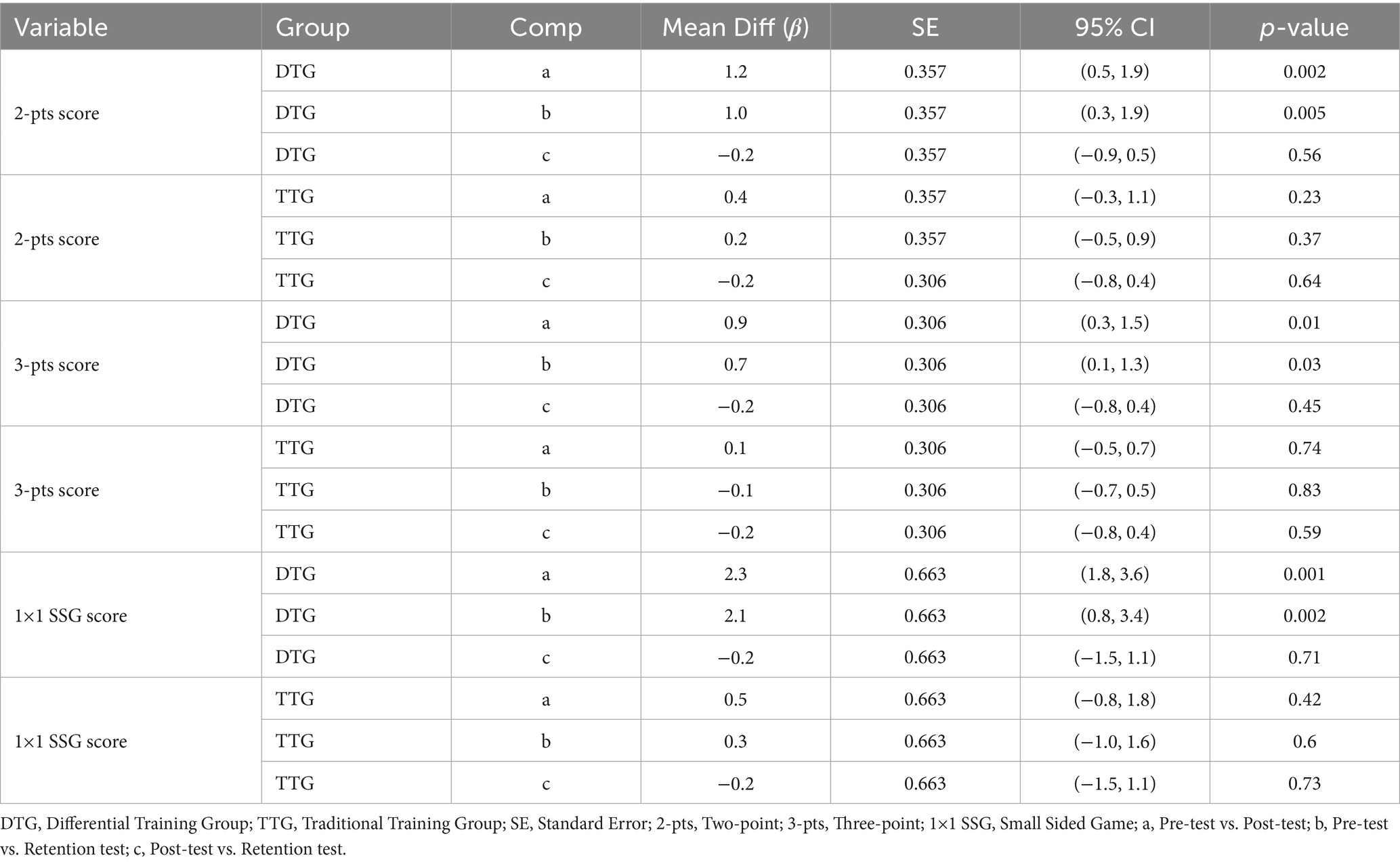 Interestingly, the acute effects of DT were not immediately distinguishable. Both the DTG and TTG groups demonstrated significant gains in shooting accuracy (β = 1.8, p = 0.02; β = 1.1, p = 0.04, respectively). This observation aligns with findings from systematic reviews, which indicate that youth basketball shooting performance is shaped by multiple factors, including distance, fatigue, defensive pressure, visual and acoustic information, etc. (França et al., 2021). These sources of variability underscore the importance of designing training interventions that simulate competitive conditions to promote transferability.