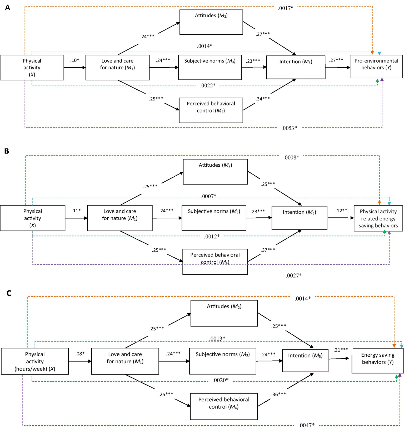 The statistical diagrams of the serial-parallel mediation models linking the students’ physical activity to eco-friendly behaviors subscales via the serial-parallel mediators: love and care for nature (M1), attitudes to save energy (M2), subjective norms to save energy (M3), perceived behavioral control to save energy (M4), and intention to save energy (M5). Covariate paths (gender) are omitted for clarity. Standardized path coefficients are displayed for ease of comparison. Solid line = significant direct effect; orange dashed line = significant specific indirect effect via love and care for nature, attitudes, and intention; light blue dashed line = significant specific indirect effect via love and care for nature, subjective norms, and intention; green dashed line = significant specific indirect effect via love and care for nature, perceived behavioral control, and intention; purple dashed line = significant total indirect effect. *p < 05. ***p < 0.0.001.