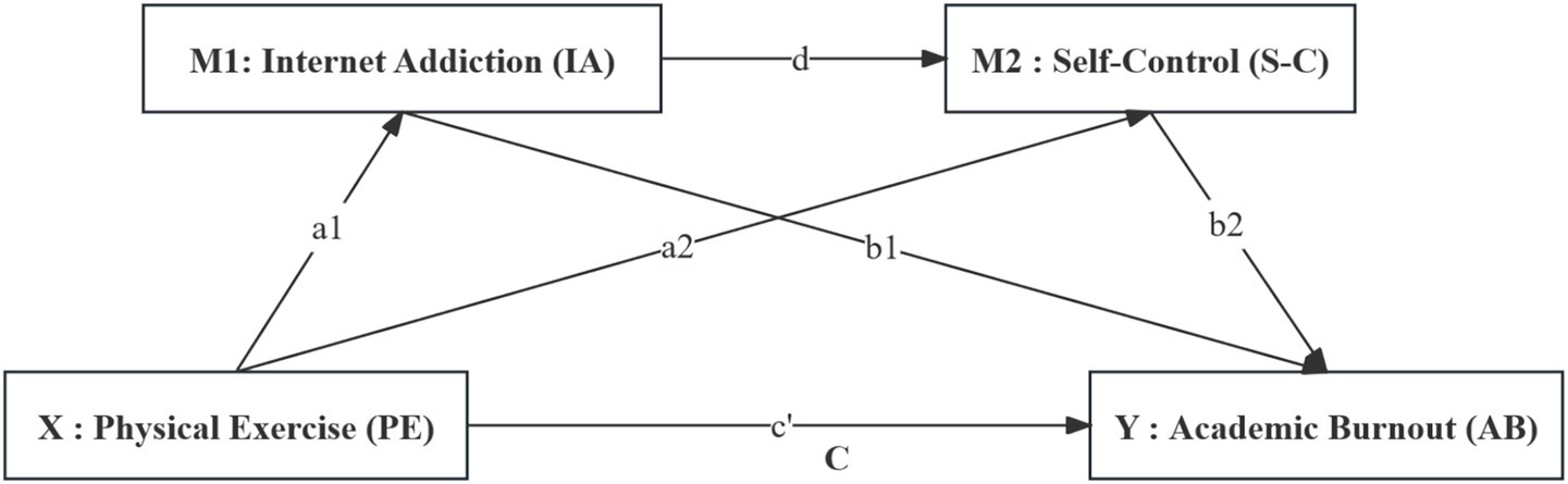 Current research indicates that self-control and Internet addiction each serve as independent mediators between physical exercise and academic burnout, with close interrelationships suggesting they may form a multiple mediation pathway. According to the protective-risk factor framework, self-control—as a protective factor—can effectively mitigate the negative impacts of risk factors such as Internet addiction (Baumeister and Tice, 2007; Kim et al., 2017). Strong self-control ability helps individuals regulate emotions and behaviors, thereby reducing excessive Internet use. Grounding in Self-Determination Theory, physical exercise can enhance intrinsic motivation and self-worth by satisfying basic psychological needs such as autonomy, competence, and relatedness. Self-control plays a crucial role in this process by helping individuals maintain exercise behavior and achieve a sense of accomplishment, which further strengthens self-regulatory capacity. However, Internet addiction may deplete self-control resources, resulting in self-regulatory failure and a subsequent vicious cycle of addiction (Baumeister and Tice, 2007). Studies have shown that physical exercise, such as running, can effectively improve self-control (Xie, 2013; Zhang et al., 2018), which may in turn indirectly suppress addictive online behaviors. Although existing studies have established relationships between physical exercise and Internet addiction, Internet addiction and academic burnout, and self-control and academic burnout, the underlying mechanisms among these four variables remain underexplored. Therefore, this study treats physical exercise as the independent variable and academic burnout as the dependent variable, with Internet addiction and self-control included as serial mediators, aiming to elucidate the complex pathways through which these variables interact. Based on the above theoretical and empirical evidence, Hypothesis H4 is proposed.