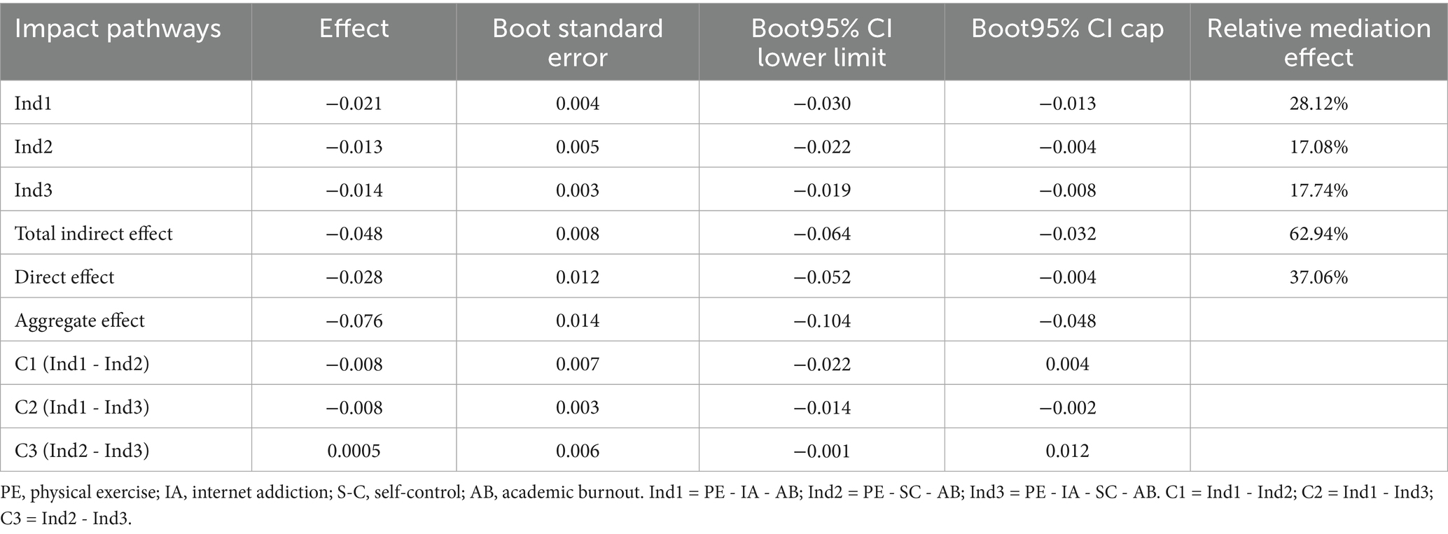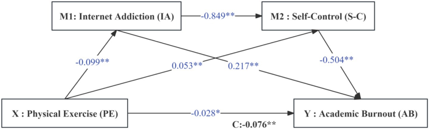 Mediation analysis indicated that both Internet Addiction and Self-Control exerted significant independent mediating effects in the relationship between Physical Exercise and adolescent Academic Burnout. This finding further reveals a dual-pathway mechanism through which Physical Exercise influences Academic Burnout.