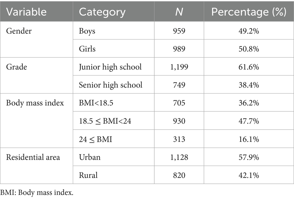 The minimum valid sample size for this study was determined as1,068, ensuring sufficient statistical power. Among the 2,212 returned questionnaires, 264 invalid responses were excluded based on predefined criteria: (1) Completion time < 240 s, (2) Incomplete demographic information, (3) Missing values (>10% unanswered items), (4) Outliers (responses exceeding ±2 SDs from the mean).