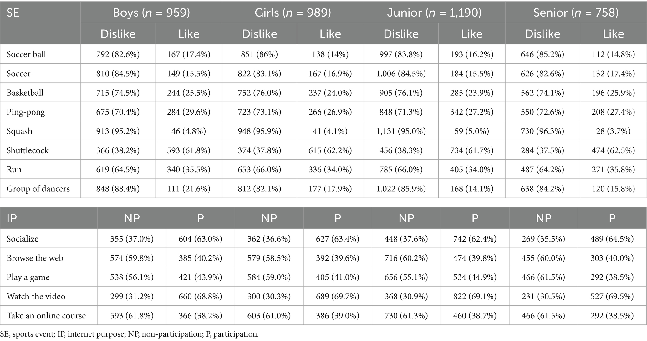 This study investigated the current status of adolescents’ participation in sports and their purposes for using the internet (see Table 2). Regarding sports participation, interest in badminton was significantly higher among different gender and grade groups compared to other sports, while tennis had the lowest participation rate, accounting for no more than 5% of respondents. As for internet usage, socializing and watching videos were the primary purposes, with both exceeding 60%. Notably, over 65% of adolescents reported watching videos as their main online activity.