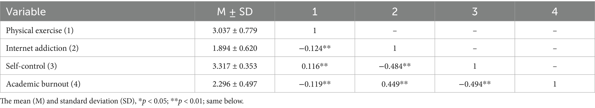 Significant correlations were observed between Physical Exercise, Internet Addiction, Self-Control, and adolescent Academic Burnout. Specifically, Physical Exercise was positively correlated with Self-Control and negatively correlated with Internet Addiction and Academic Burnout. Internet Addiction was positively correlated with Academic Burnout and negatively correlated with Self-Control. Self-Control was negatively correlated with Academic Burnout.