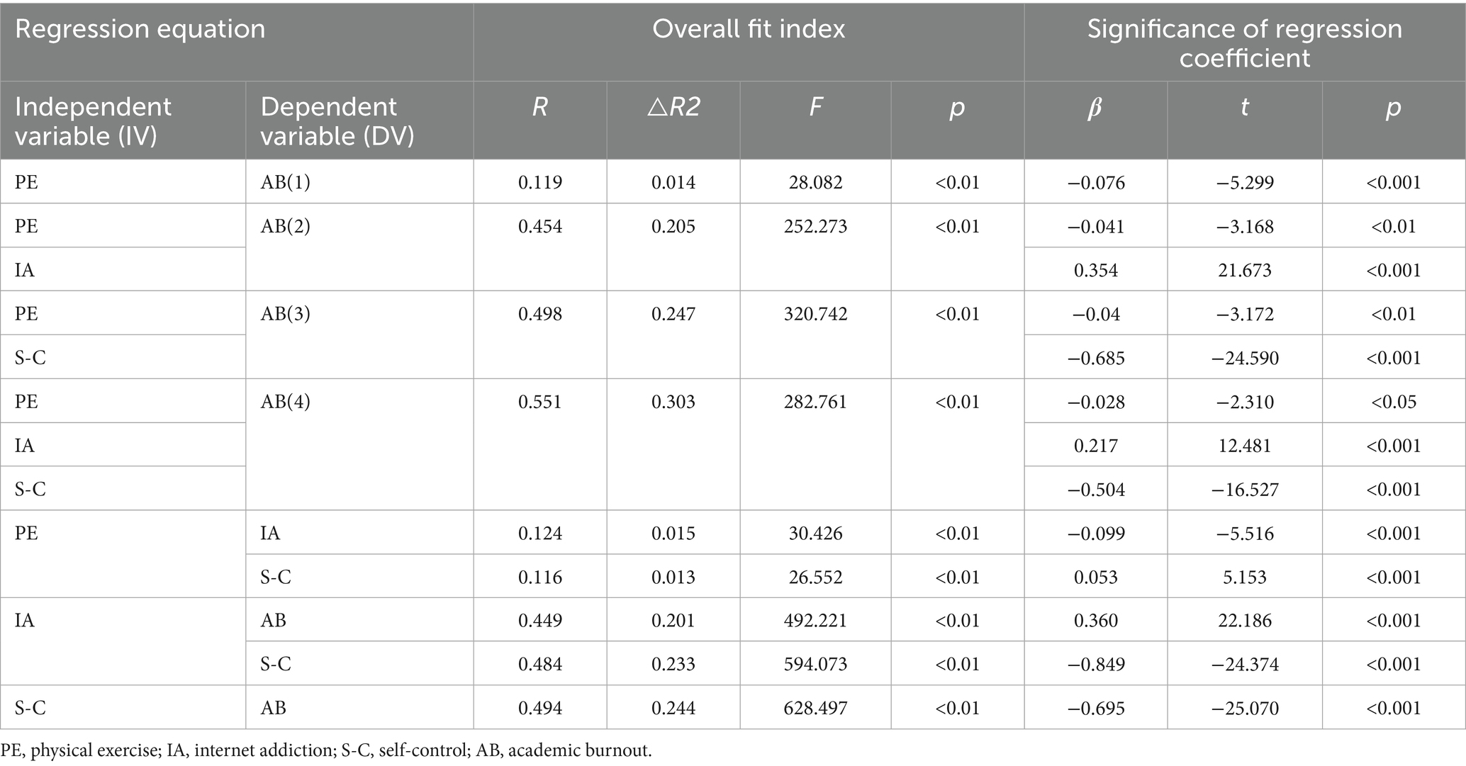 To investigate the intrinsic relationships among Physical Exercise, Internet Addiction, and Self-Control in predicting Academic Burnout, regression analyses were conducted using these three factors as independent variables and Academic Burnout as the dependent variable, based on preliminary correlation analyses. The statistical results are presented in Table 4.
