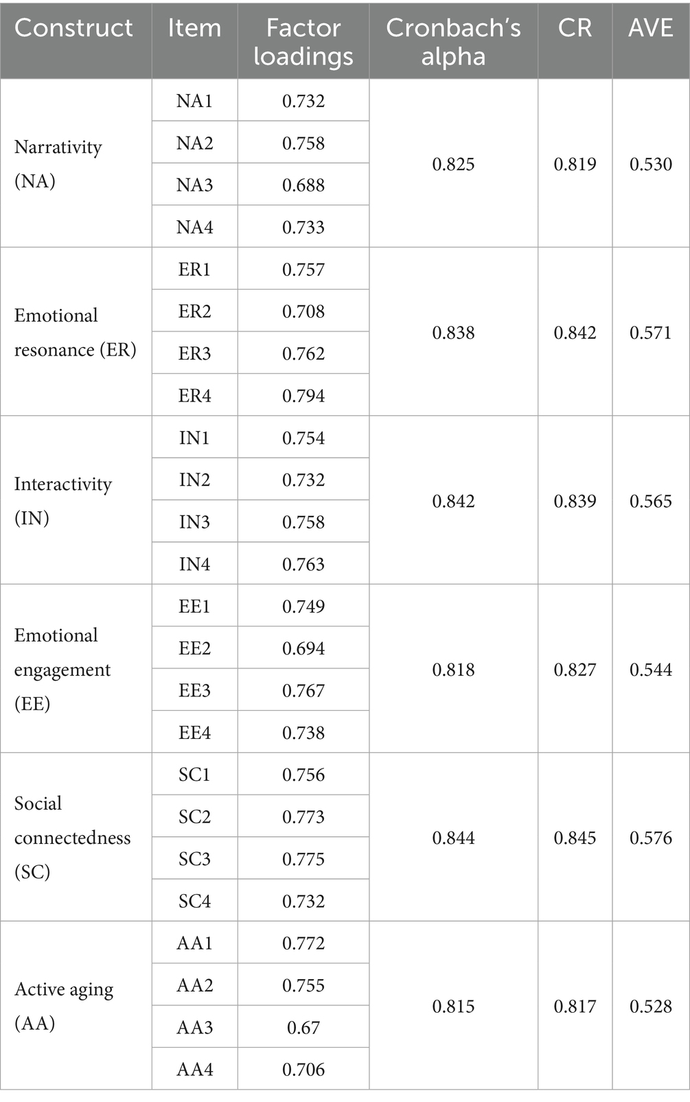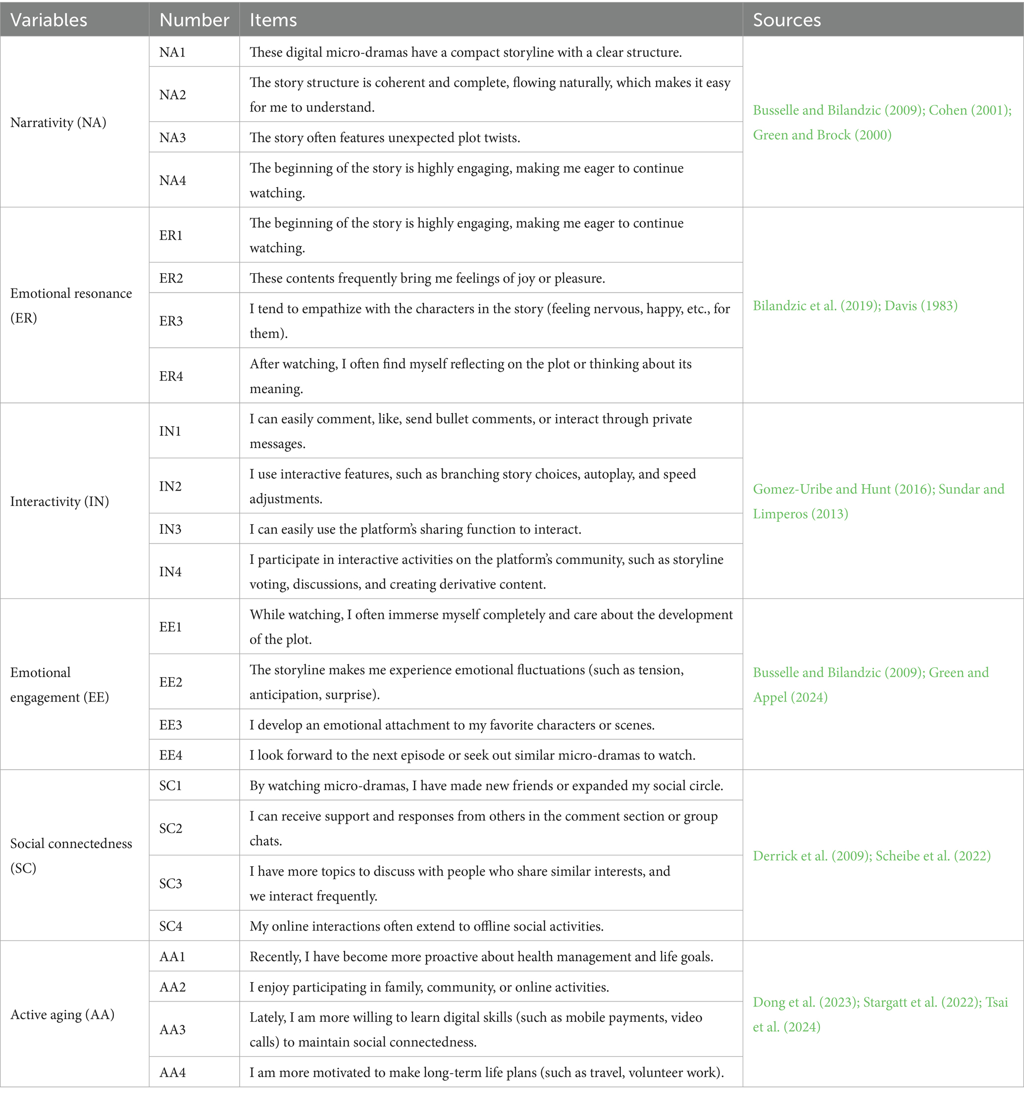 The six core variables involved in this study (narrativity, emotional resonance, interactivity, emotional engagement, social connectedness, and active aging) are all measured using established scales. As listed in Table 1, the scale items for each variable are primarily adapted from mature studies in the respective fields and have been revised and optimized to fit the specific context and target population of this research. All scale items use a 7-point Likert scale for measurement, where 1 represents “Strongly Disagree” and 7 represents “Strongly Agree” to assess the strength of the respondents’ attitudes.