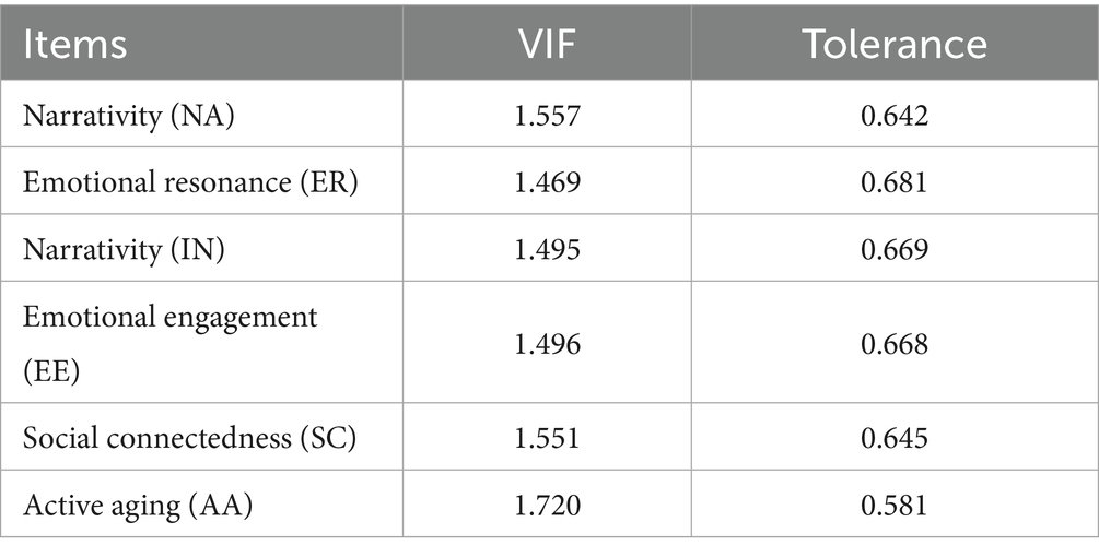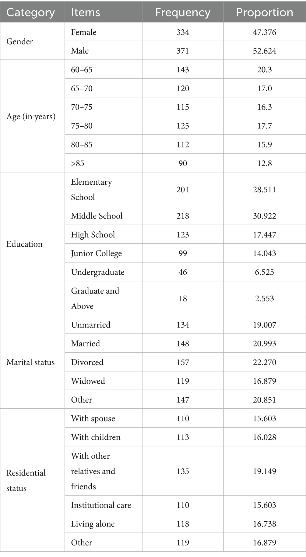 Descriptive statistical analysis was conducted on 705 valid questionnaires, and the results are listed in Table 2. Notably, 52.62% of the respondents are male and 47.38% are female, with a relatively balanced gender ratio (MobTech, 2020). In terms of age distribution, the 60–65 age group accounts for 20.3%, whereas the 65–70 age group comprises 17%. These two age groups have higher proportions of respondents, reflecting that the sample is primarily composed of the elderly (Wu and Wen, 2023). Regarding education level, a large proportion of respondents have middle school or lower education, with 30.92% having completed middle school and 28.51% having primary school education. The percentage of respondents with higher education, such as college or university degrees, is relatively low, at 14.04 and 6.53%, respectively, indicating that the overall education level of the sample is on the lower side. Marital status shows a diverse distribution, with 22.27% being divorced, 20.99% married, 19.01% unmarried, and 16.88% widowed, reflecting the diversity in marital status within the elderly population. Regarding living arrangements, the majority of respondents live with relatives or friends (19.15%), followed by those living alone (16.74%), with children (16.03%), or with spouses (15.60%), showing the variety in living choices. Overall, the sample in this study is representative in terms of gender, age, education level, marital status, and living arrangements, providing a solid foundation for subsequent research.