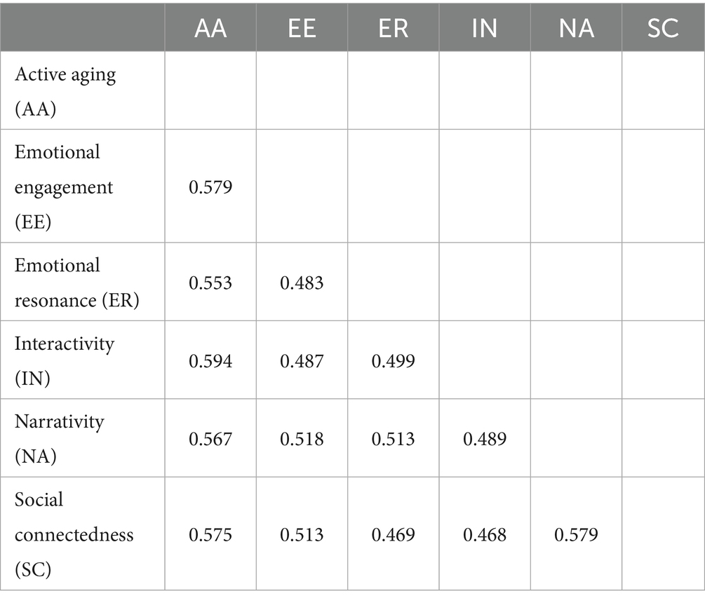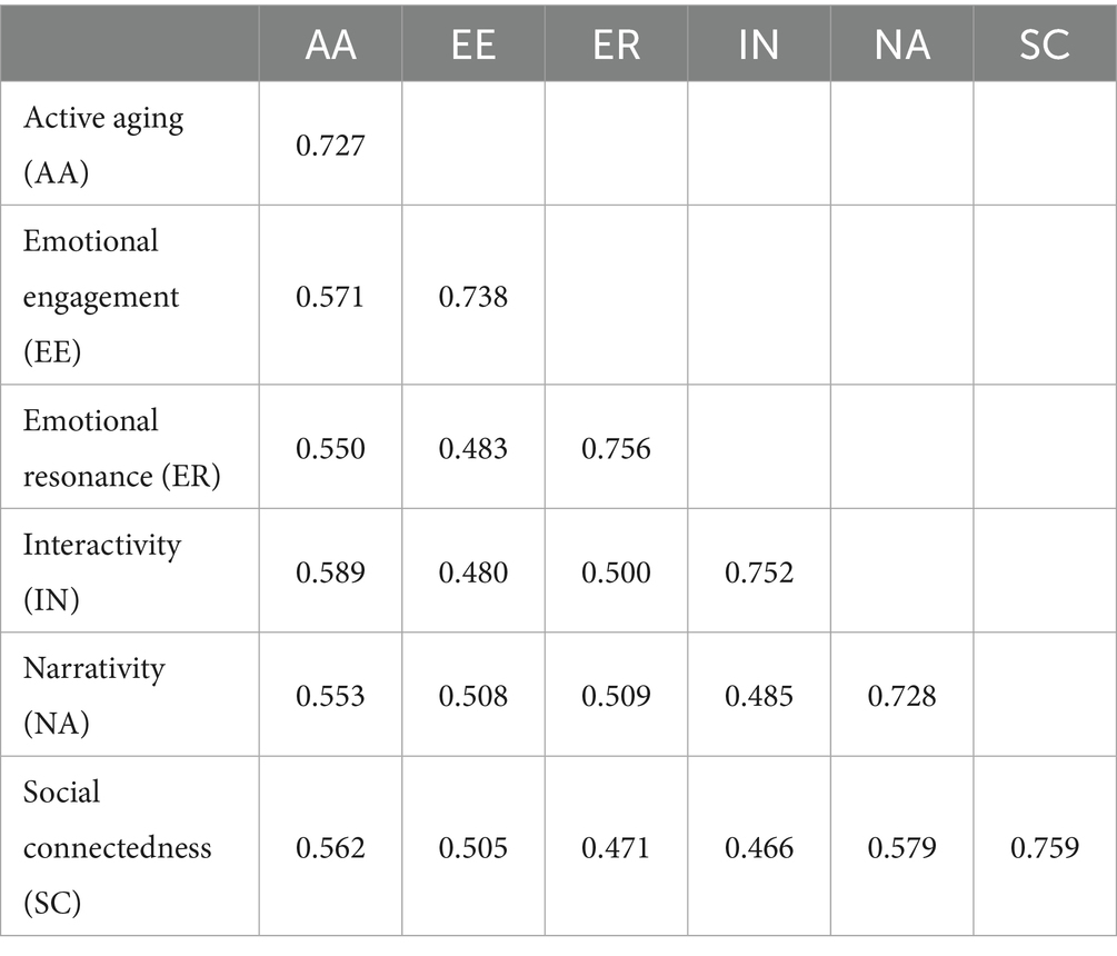 This study employs two methods to verify the discriminant validity of the model. The first method is the Fornell–Larcker criterion, which states that the correlation between latent variables should be smaller than the square root of their respective AVEs. The second method is the Heterotrait–Monotrait ratio (HTMT), with the criterion that the HTMT value should be below 0.85 (Henseler et al., 2015). The discriminant validity of the model in this study was verified by both methods. The results are listed in Tables 4, 5.