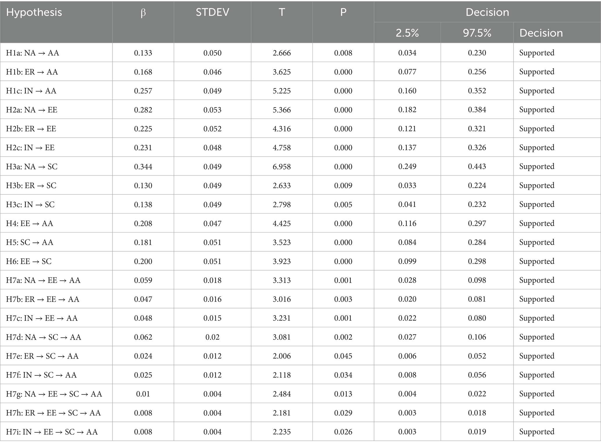 SC mediates the relationship between NA and AA (β = 0.062, T = 3.081, p = 0.002), ER and AA (β = 0.024, T = 2.006, p = 0.045), and IN and AA (β = 0.025, T = 2.118, p = 0.034). Therefore, hypotheses H7d, H7e, and H7f are supported.