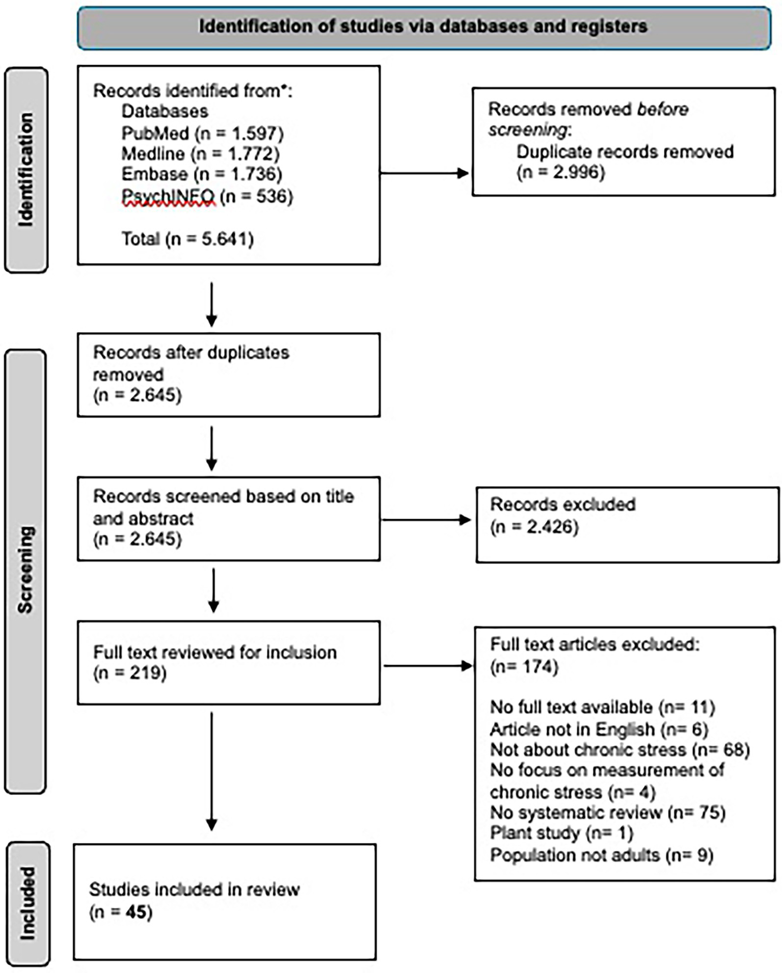 First, all articles retrieved from the databases (a total of 5,641 articles) were uploaded into Rayyan, an online tool for systematic reviews, and duplicates were removed, leaving 2,645 unique records. One author conducted an initial title and abstract screening. To ensure a thorough title and abstract screening, we first tested the preliminary inclusion and exclusion criteria on two separate data samples (one of 20 articles and another of 30 articles). Discrepancies were discussed between three reviewers, and the criteria were refined accordingly. After this refinement, the first author completed the title and abstract screening, resulting in 219 articles selected for full-text review. To further calibrate our refined criteria at the full-text level, we first selected a data sample of 10 full-text articles, which was independently evaluated by three reviewers. During the discussion of this sample, we introduced additional refinements, clarifying that only articles focusing explicitly on chronic stress, whether framed as chronic stress itself or in the context of burnout (including terminology such as “prolonged,” “persistent,” “long-term,” or “sustained,” stress, whether or not in combination with “(clinical) burnout,” “job burnout,” “occupational burnout” or “exhaustion disorder”), would be included. We excluded articles centered on acute or short-term stress, without clearly positioning this form of stress as chronic stress. Consequently, articles referring primarily to “work-related stress,” “workplace stressors,” “work environment,” or “working conditions,” without indicating chronicity were excluded. After integrating these further refinements, two reviewers independently screened another set of 10 full-text articles, confirming that the criteria were now consistently interpretable. With these criteria firmly in place, one reviewer proceeded to screen all remaining full-text articles. Finally, 45 articles remained. The study-selection process is depicted in Figure 1.