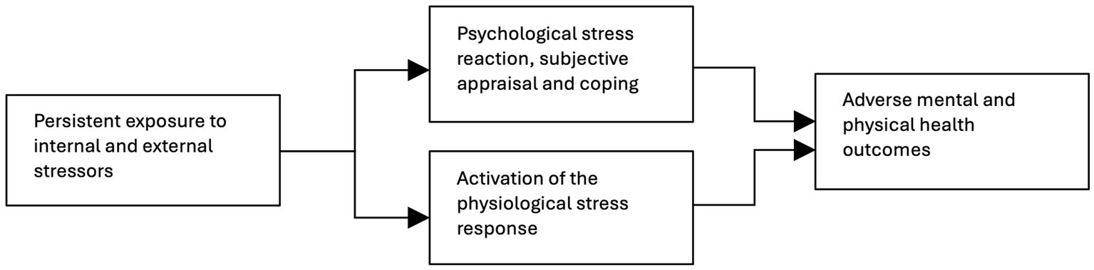 Despite the lack of consensus on how clinical burnout is defined, there is general agreement that chronic stress, whether work-related or stemming from personal life stressors, plays a key role in triggering the debilitating symptoms associated with clinical burnout (Khammissa et al., 2022; Vinkers, 2022; Bianchi and Schonfeld, 2024; De Beer and Schaufeli, 2025). Understanding how chronic stress is defined and measured, is therefore essential to advancing both clinical practice and research in this field. This need is underscored by the broader body of research showing that chronic stress is not only implicated in burnout but also constitutes a major global contributor to mental and physical health problems. According to the World Health Organization (2022), over 970 million people suffer from mental or neurological disorders, many of which are stress related. While acute stress responses serve adaptive functions, prolonged or chronic stress has been consistently linked to adverse health outcomes, including depression, anxiety, and burnout (Marin et al., 2011), as well as cardiovascular disease, metabolic disturbances, and autoimmune dysfunction (McEwen, 1998; O'Connor et al., 2021). Despite the extensive research linking chronic stress to negative health outcomes, there is currently no universally accepted definition of what constitutes chronic stress. In the context of clinical burnout, the absence of a shared understanding of chronic stress presents a critical gap. This lack of definitional clarity hampers progress in identifying at-risk populations, comparing outcomes across studies, and designing effective interventions. Given the overlap between chronic stress and burnout, developing a coherent conceptual and measurement framework for chronic stress may help inform future efforts to define and diagnose clinical burnout more precisely.