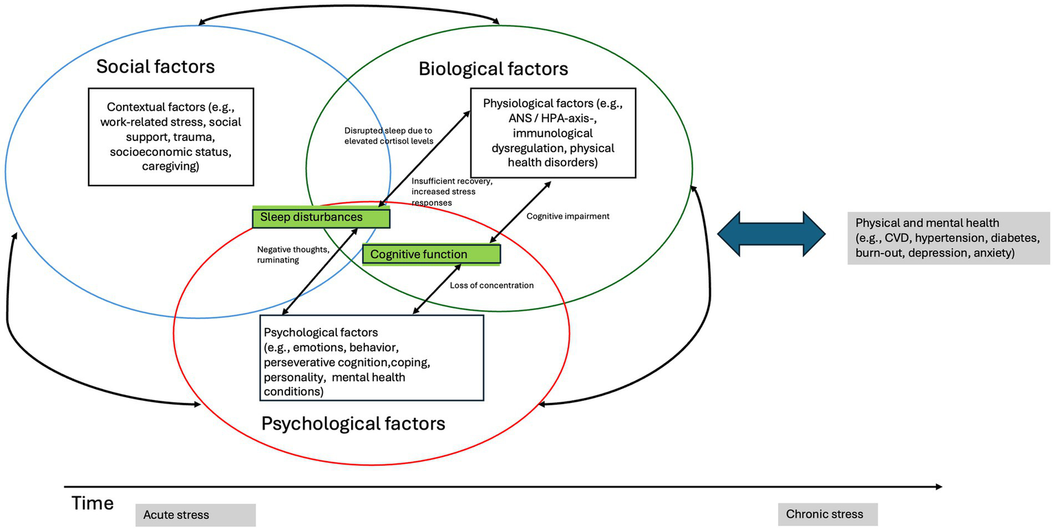 Biological stress reactions Physiological responses related to the neuroendocrine (HPA-axis), immune, metabolic and cardiovascular system, epigenetics, cellular aging Psychological stress reactions Perceived stress, changes in mood and emotion Behavioral stress reactions Cognitive impairments Overall cognitive ability, attention, memory Sleep disturbances Insomnia, poor sleep quality |