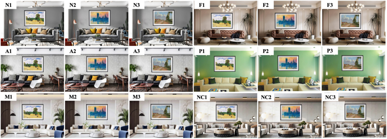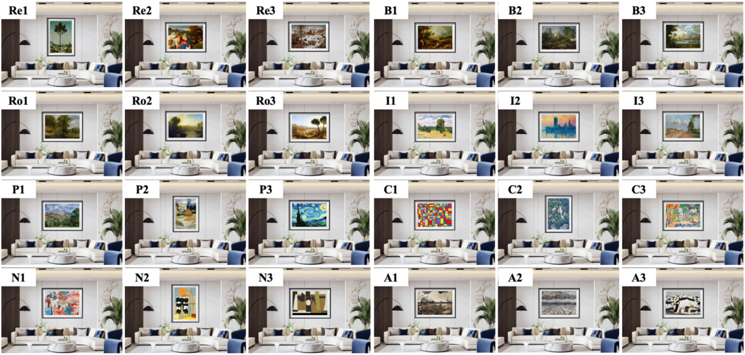 We collected 42 sample images and divided them into 2 groups. The first group comprised scene images of eight styles of decorative oil paintings placed within modern-style (the most common) interior environments, including Renaissance, Baroque, Romanticism, Impressionistic, Post-Impressionistic, Contemporary art, Modernism, and Abstractionism. Three images were selected for each style. All sample images were processed using Photoshop to ensure uniform dimensions (2,958 × 1,837 pixels), with consistent brightness and clarity, as shown in Figure 1. The second group featured Impressionistic oil paintings within six common interior design styles: Nordic, French, American, Pastoralism, Modern, and New Chinese. The size and image processing levels were consistent with those in the first group, as shown in Figure 2. Three images were selected for each style, and the number of stimuli per style follows previous neuroaesthetic studies using controlled visual stimuli to reduce extraneous variability (Vartanian and Goel, 2004).