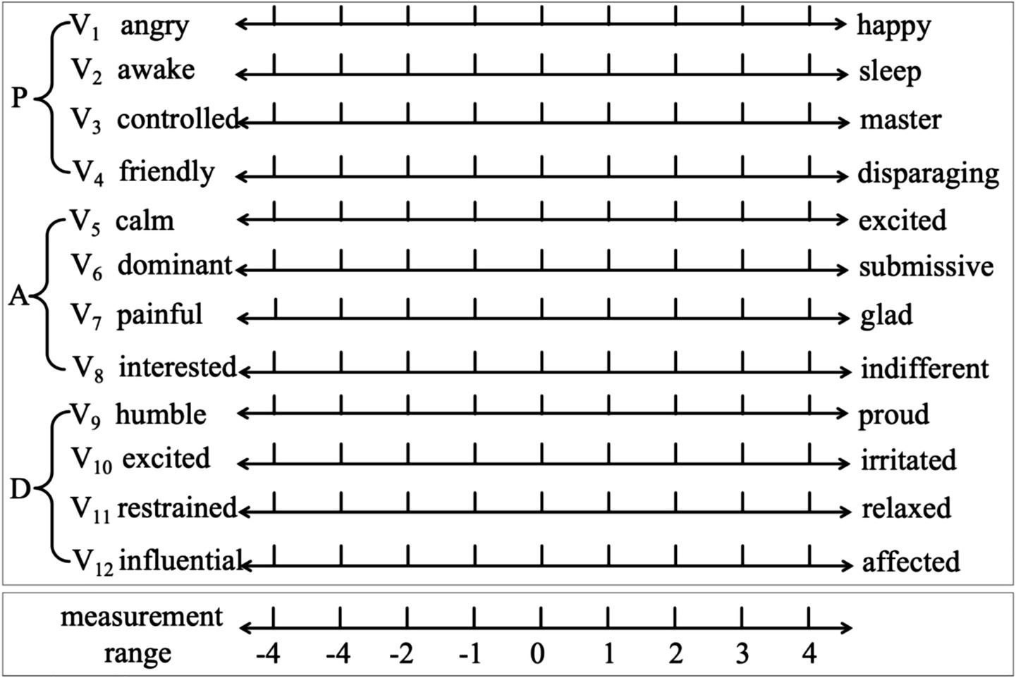 The Institute of Psychology of the Chinese Academy of Sciences developed a standardized Chinese version of the PAD model to align with Chinese emotional characteristics. This scale was a multidimensional emotion measurement tool based on the multidimensional emotion space model. The scale used a 9-point rating mechanism with positive and negative poles. Each of the three dimensions (P, A, and D) included four groups of semantically opposite adjectives to describe human emotions, as shown in Figure 3. The actual PAD measurement values were calculated using Equations 1–3. Because the PAD analysis in this study involved descriptive comparisons of mean emotional ratings across conditions, effect sizes were reported following APA recommendations for non-inferential research. Standard deviations were not required in this exploratory paradigm; therefore, effect sizes were computed using a standardized mean difference (SMD) metric suitable for descriptive data. The SMD was defined as Equation 4, which formulation provides a normalized estimate of the magnitude of difference between two emotional responses without requiring variance estimates, which is appropriate for exploratory affective and neuroaesthetic studies.