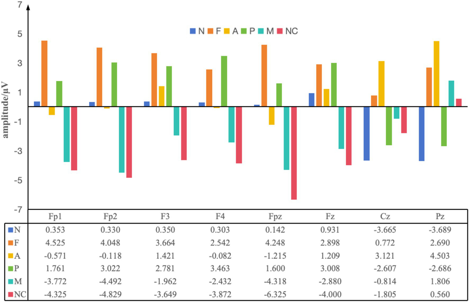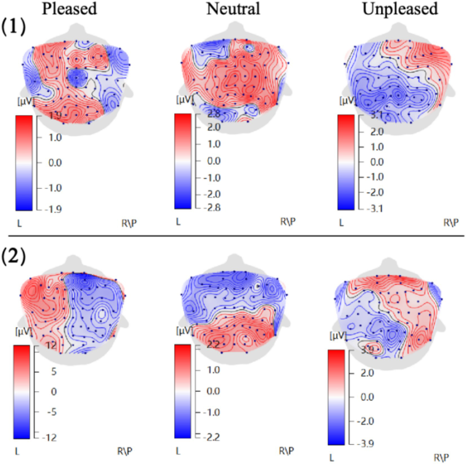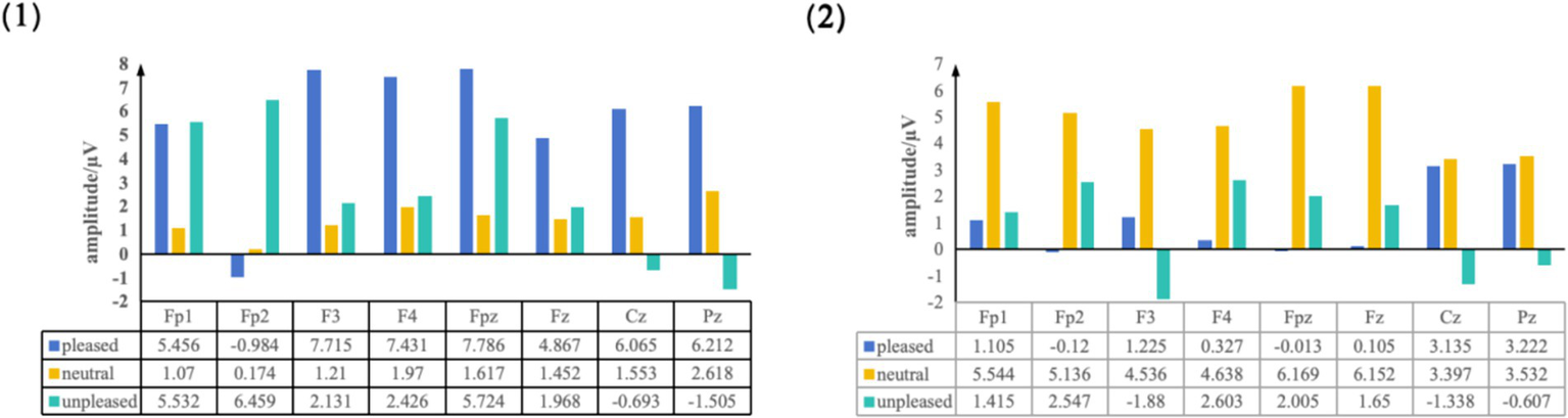 The frontal lobe is primarily associated with thinking, emotion, planning, and needs. Therefore, the frontal alpha asymmetry (FAA) can be used to compare emotional differences in response to various stimuli. The left frontal region is primarily involved in processing positive emotions, whereas the right frontal region is associated with negative emotions (Briesemeister et al., 2013). This is consistent with the “valence hypothesis”: left hemisphere activity increases during positive emotional states, whereas right hemisphere activity increases during negative emotional states. Therefore, in this study, the frontal lobe was selected as the object, recording EEG data from channels FP1 (left frontal pole), FP2 (right frontal pole), F3 (left frontal), F4 (right frontal), FZ (frontal midline), CZ (central midline), and PZ (parietal midline). The 7-channel montage was focused on frontal and midline regions, which are the primary scalp locations associated with emotional valence and cognitive appraisal (Coan and Allen, 2004). Although this does not provide full scalp coverage, such reduced-channel systems have been widely used in affective computing and neuroaesthetic studies. Future research may employ high-density EEG to improve spatial resolution.