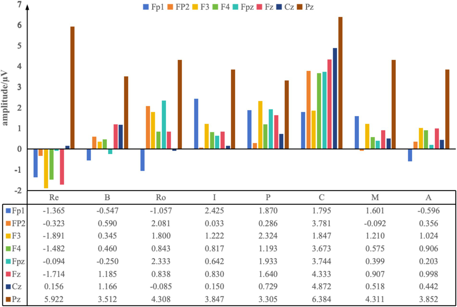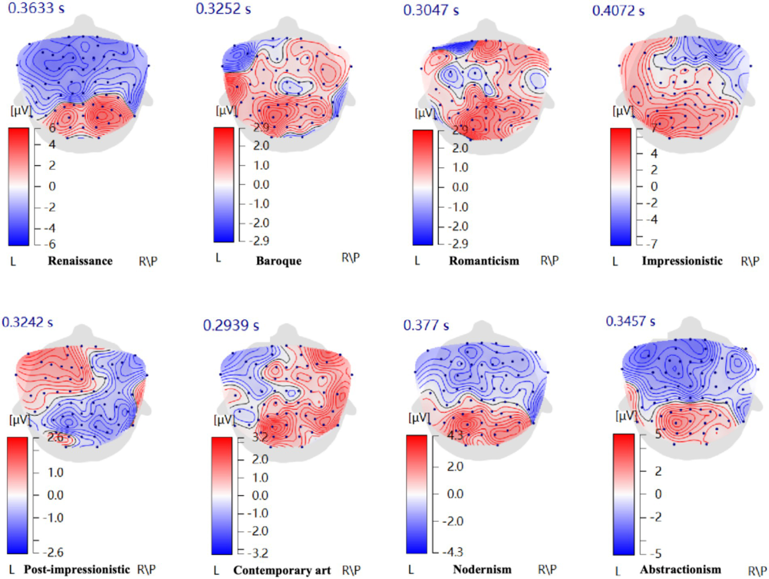 Meanwhile, electroencephalography (EEG) is a vital neurophysiological tool that allows real-time monitoring of brain activity. It reveals the neural mechanisms involved in aesthetic experience and environmental perception (Rui and Gu, 2021). EEG technology, with its high temporal resolution, can capture immediate neural responses of individuals to artistic works and spatial environments. Existing studies have demonstrated a close association of specific EEG frequency bands (α, β, and θ waves) with emotional processing, aesthetic experience, and cognitive engagement (Klimesch, 1999; Capotosto et al., 2009). Meanwhile, the stimulation-specific neural responses of EEG signals are often analyzed using ERPs. Emotional visual stimuli typically elicit ERP components such as (second positive peak), N2 (second negative peak), P300 (third positive peak), and the late positive potential (LPP).