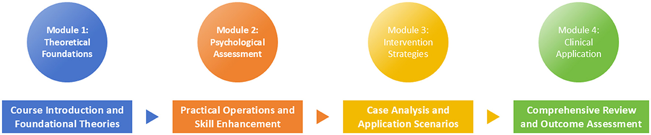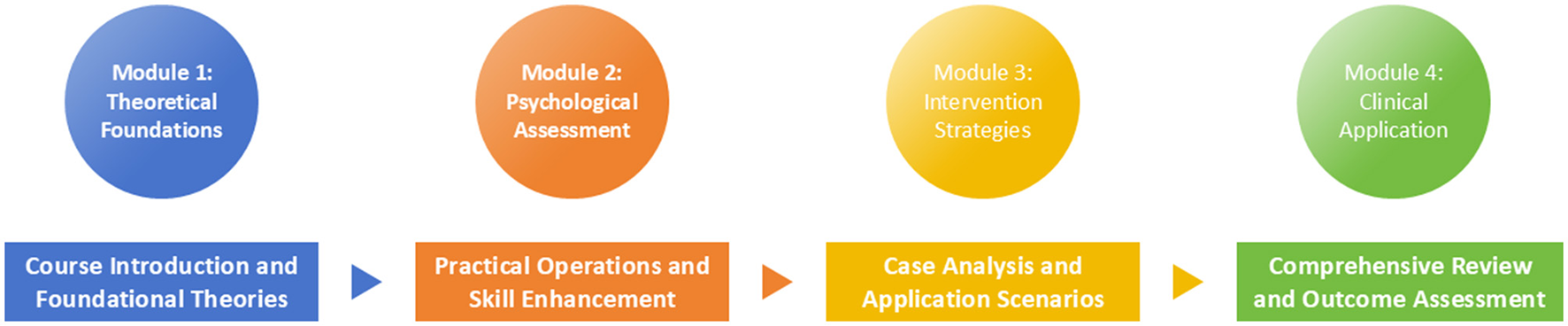 The course content was systematically developed based on evidence-based psycho-oncology literatures and validated educational frameworks to ensure scientific rigor and clinical relevance. Prior to course delivery, the 4-member instructor team completed a 4-h standardized training program to ensure uniform delivery of course content and alignment with psycho-oncology educational best practices. The course comprised 24 contact hours (distributed evenly across the 6-week period, 4 h/week) delivered through multiple pedagogical approaches. As summarized in Figure 1, the course followed a “knowledge → skill → application” logic, was structured into four sequential modules: