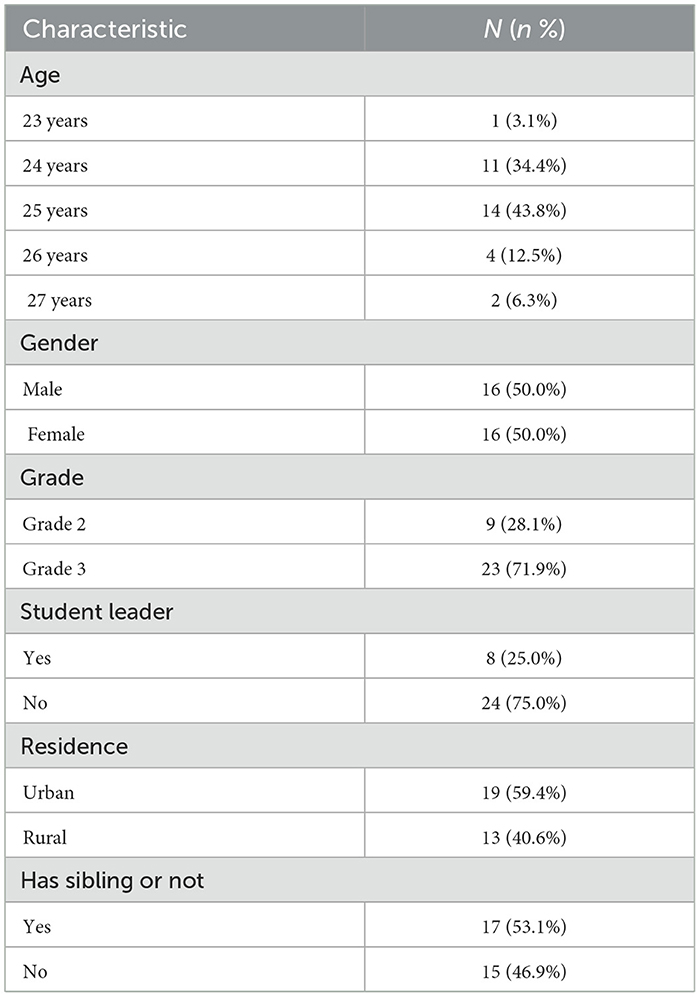 A total of 32 postgraduate medical students were included in the final analysis. The demographic characteristics of the participants are presented in Table 1. The majority were aged 24–25 years (78.1%), with an equal gender distribution (50% male, 50% female). Most were in their third year of postgraduate training (71.9%), did not hold student leadership positions (75.0%), and were from urban areas (59.4%). Slightly more than half of the participants (53.1%) reported having siblings.