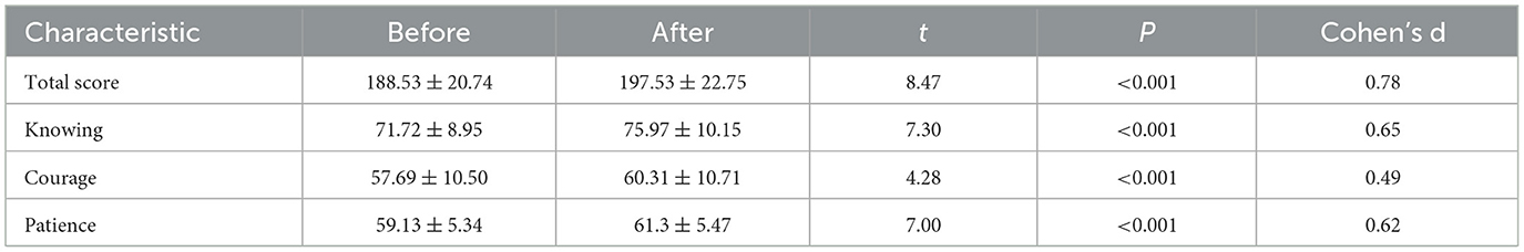 The total CAI score and scores in all three dimensions (Knowing, Courage, and Patience) increased significantly from pre- to post-course assessments (all P < 0.001, Table 2). The total CAI score increased by an average of 9.00 points after the course, with a medium effect size (Cohen's d = 0.78), indicating a practically meaningful enhancement in overall caring ability. Among dimensions: the Knowing dimension showed a medium effect size (Cohen's d = 0.65), reflecting substantial gains in students' ability to recognize cancer patients' psychological needs; the Courage dimension had a small-to-medium effect size (Cohen's d = 0.49), consistent with modest but meaningful improvements in students' confidence to provide psychological support; the Patience dimension demonstrated a medium effect size (Cohen's d = 0.62), highlighting enhanced tolerance for emotional expressions during patient interactions. The largest relative increase was observed in the Courage dimension (4.54%), followed by the Knowing (5.93%) and Patience (3.67%) dimensions.