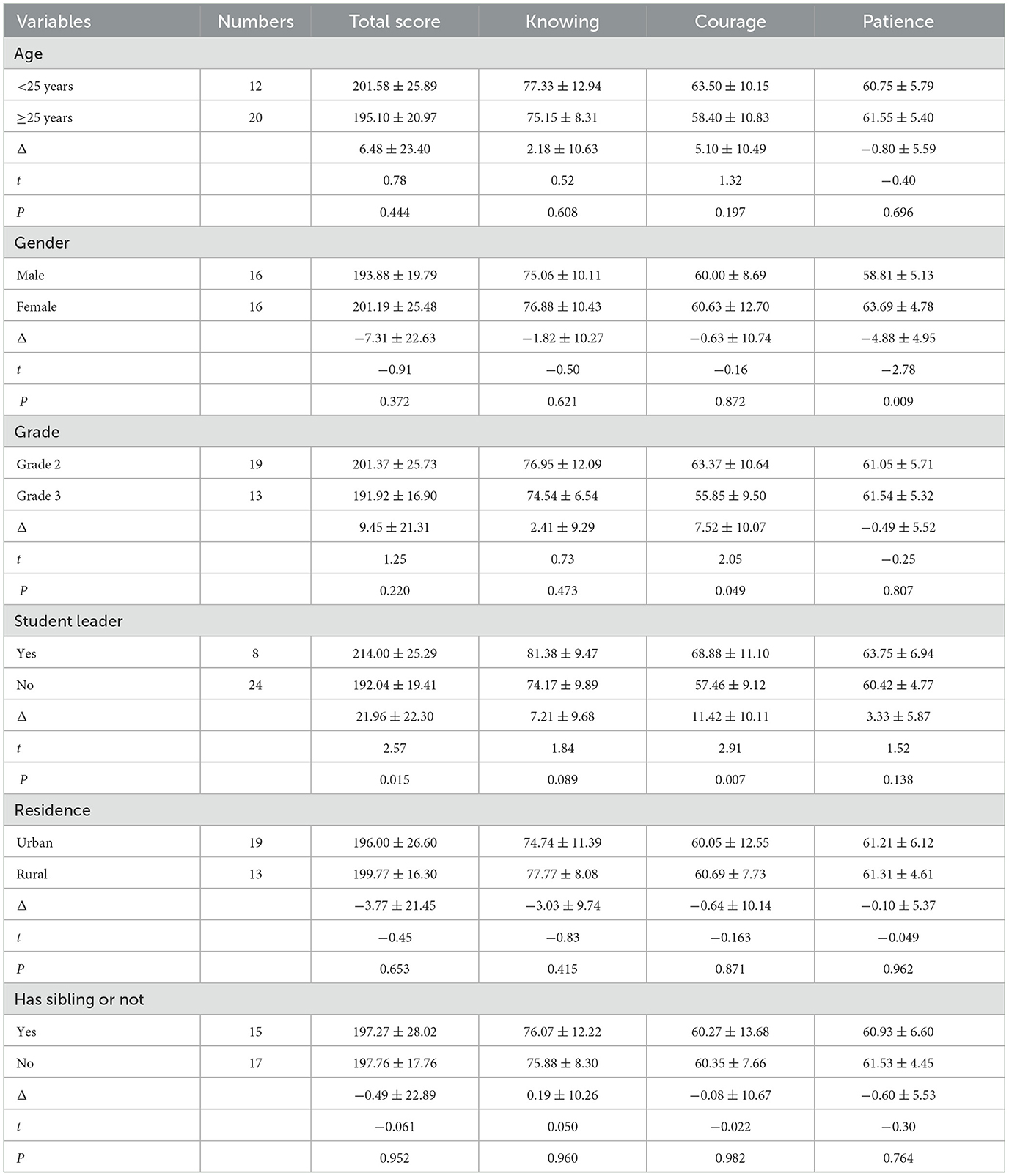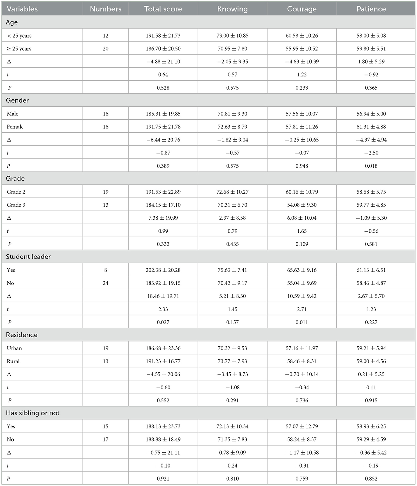 Results: A total of 32 students completed both assessments. The total CAI score increased significantly from pre-course to post-course (188.53 ± 20.74 vs. 197.53 ± 22.75, P < 0.001). Significant improvements were observed in all three dimensions: Knowing (71.72 ± 8.95 vs. 75.97 ± 10.15, P < 0.001), Courage (57.69 ± 10.50 vs. 60.31 ± 10.71, P < 0.001), and Patience (59.13 ± 5.34 vs. 61.30 ± 5.47, P < 0.001). Female students demonstrated consistently higher Patience dimension scores than males both before and after the course (P < 0.05). Student leaders showed superior total CAI and Courage dimension scores compared to non-leaders at both time points (P < 0.05).