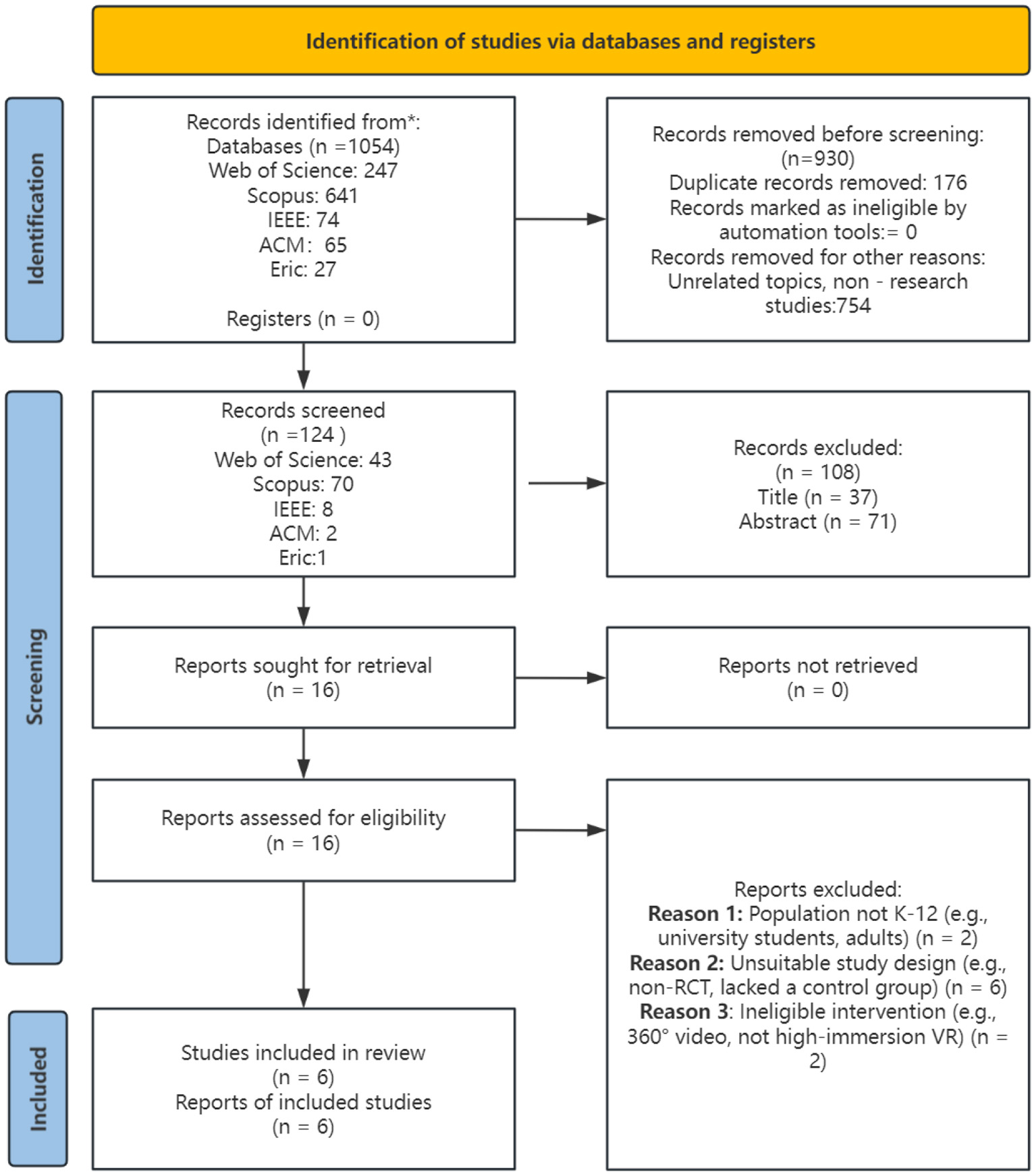 The study selection process was conducted by two independent reviewers (Author X and Author Y). Titles and abstracts were screened first, followed by a full-text assessment against the inclusion criteria. Any disagreements were resolved through discussion or, if necessary, consultation with a third reviewer (Author Z). An overview of the study screening procedure is presented (Page et al., 2021) (Figure 1). The initial database query yielded 1,054 entries. Following the exclusion of 930 records comprising 176 duplicates and 754 items removed due to irrelevance or non-academic content a total of 124 records were assessed for eligibility based on their titles and abstracts. This screening of 124 records led to the removal of 108 articles, leaving 16 reports that were sought for full-text retrieval and assessed for eligibility against the inclusion criteria. Ten reports were excluded for the following reasons: the population was not K-12 (n = 2), the intervention did not meet eligibility criteria (n = 2), or the study design was insufficient (e.g., non-RCT, quasi-experimental, or lacked a control group) (n = 6). In total, six studies fulfilled all inclusion criteria and were incorporated into the final synthesis.