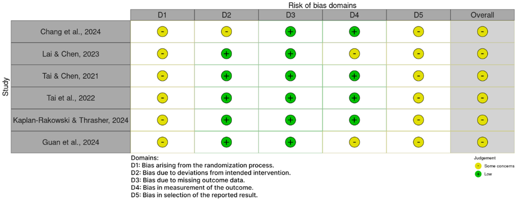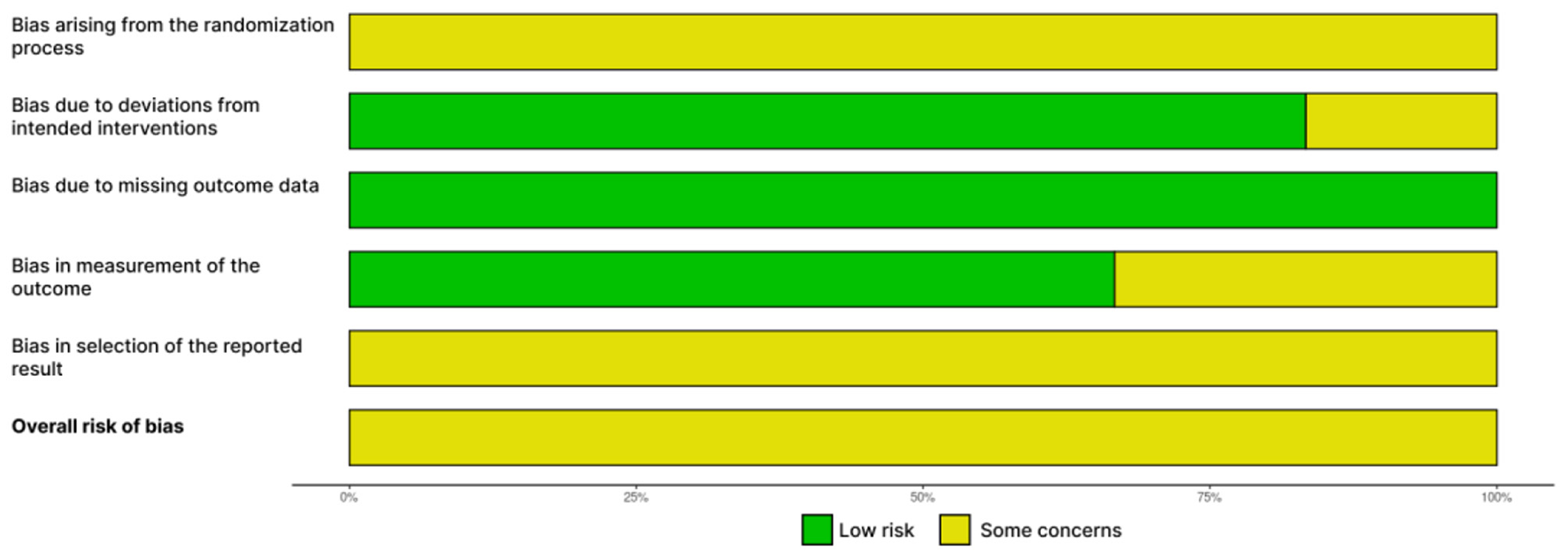 The methodological quality of the six included trials was assessed using the Cochrane Risk of Bias 2 (RoB 2) tool (Sterne et al., 2019). Overall, all six trials were rated as having “Some concerns” for bias. A summary of the risk of bias assessments across all studies is presented in Figure 2, with a detailed study-by-study breakdown provided in Figure 3.