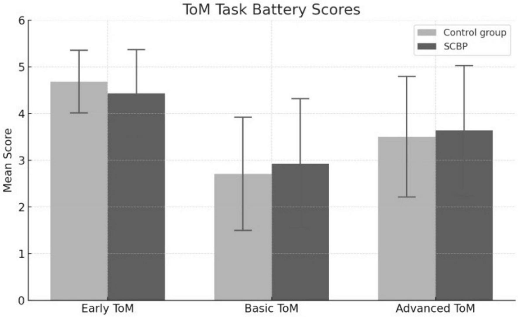 To examine whether the groups differed in their performance on the ToM Task Battery, three ANCOVAs with age as covariate, since ToM development is strongly associated with age, therefore even minor differences in average age between the two groups could explain differences in ToM scores. The ANCOVAs were performed separately for each scale (Early, Basic, Advanced) and group (SCBP, control group) as fixed factors.