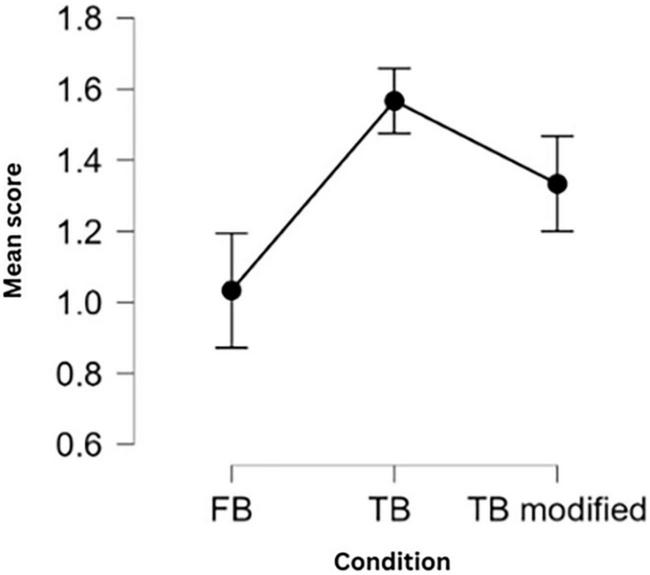 A repeated measures ANOVA was conducted to examine changes across three conditions (FB, TB, TB modified) of a within-subjects factor, group (SCBP, control) as between-subject factor, and age as covariate.