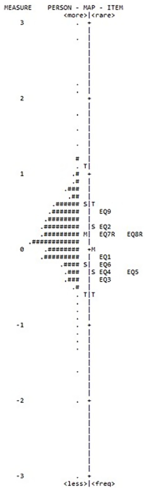 In Figure 2 both the location of person abilities and item difficulties, respectively, along the same latent dimension were plotted on the same logit scale. The top part of the figure depicted the most able people and the most difficult items (EQ9), while the less able people and the less difficult items (EQ3) were positioned in the bottom part of the figure.