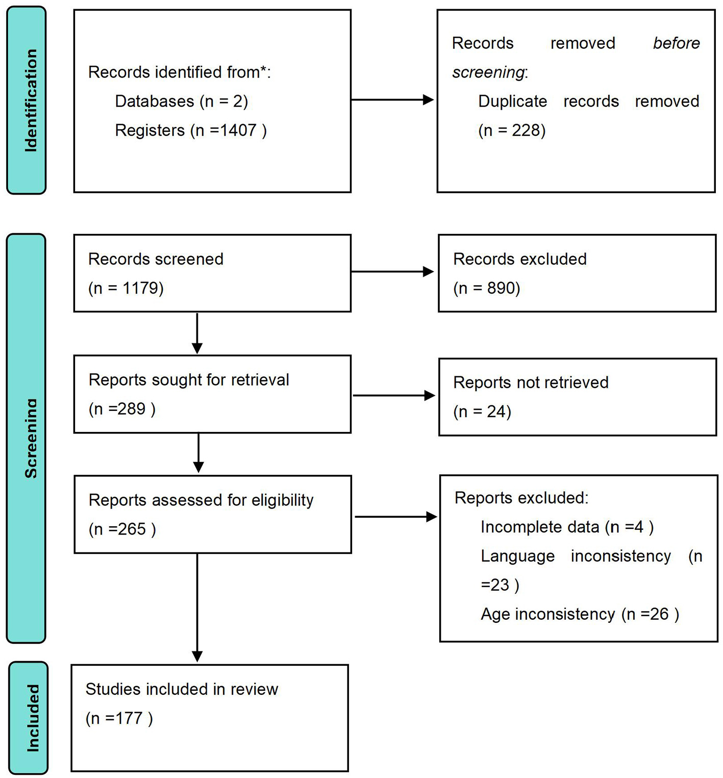 The PRISMA flow diagram (Figure 1) summarizes the process for the literature search and selection. After searching the databases, there were a total of 1,407 records. Following the removal of duplicates, 1,179 records were screened by titles and abstracts with 890 excluded. The remaining 289 articles were obtained to assess eligibility. After retrieval, 111 articles were excluded for not meeting the inclusion criteria. The final total included in the meta-analysis was 177 studies (Girard et al., 2019; Guo et al., 2022; Kokkonen et al., 2019; Kim et al., 2025; Kröske, 2017; Castro-Sánchez et al., 2020; Borrego et al., 2021; Zach et al., 2020; Kipp and Weiss, 2015; Brisimis et al., 2022; Jakobsen, 2023; Pop et al., 2022; Ortega et al., 2018; Extremera et al., 2015; Huhtiniemi et al., 2022; Wagnsson et al., 2016; Espinoza Gutiérrez et al., 2024; Stanger et al., 2018; Kavussanu and Ring, 2021; Pineda-Espejel et al., 2021; Coutinho et al., 2024; Chu et al., 2021; Marcelino, 2025; Coudevylle et al., 2015; Pulido et al., 2020; Gaudreau et al., 2016; McLaren et al., 2017; Habeeb et al., 2023; McKay et al., 2025; Morales-Sánchez et al., 2022; Vallerand, 2000; Abós et al., 2017; McLaren et al., 2015; Jaakkola et al., 2016, 2017; Balaguer et al., 2018; Xu et al., 2025; Hogue et al., 2019; Castro-Sánchez et al., 2018; Çaglar et al., 2017; Ulaş et al., 2020; Cruz Feliu et al., 2016; Tristán et al., 2021; Breiger et al., 2015; Hancox et al., 2017; Bengoechea et al., 2017; Danioni et al., 2021; Zhang et al., 2024; Bugten et al., 2025; Morales-Sánchez et al., 2020; Deng et al., 2023; Bolter and Kipp, 2018; Zarrett et al., 2015; Gómez-López et al., 2024; Gustafsson et al., 2016; Alesi et al., 2019; Grastén, 2016; Castro-Sánchez et al., 2019a; Guo et al., 2021; Cheon et al., 2022; Kokkonen et al., 2020; Méndez-Giménez et al., 2018; Gómez-López et al., 2020; Martin and Horn, 2025; Castro-Sánchez et al., 2019c; Sukys et al., 2020; Ettekal et al., 2016; Rodrigues et al., 2024; Marjanović et al., 2019; Lindell-Postigo et al., 2023; Hauser et al., 2024; Cheon et al., 2023; Kim et al., 2016; Ruiz et al., 2017; Castillo-Jiménez et al., 2022; Jang et al., 2020; Wu et al., 2021; Moreno-Rosa et al., 2024; Wang et al., 2021; Ada et al., 2021; Raimundi et al., 2023; Mosqueda et al., 2019; Kipp and Bolter, 2024; Shen, 2015; Morela et al., 2017; Gil-Arias et al., 2020; Castro-Sánchez et al., 2019d; Durdubas et al., 2020; Theodosiou et al., 2021; Flores-Piñero et al., 2024; Elsborg et al., 2023; Cecchini et al., 2019; Buch et al., 2016; Chan et al., 2025; Bortoli et al., 2017; Weeldenburg et al., 2022; Into et al., 2020; Weltevreden et al., 2018; Tamminen et al., 2016; Morela et al., 2021; Álvarez et al., 2019; Rodrigues et al., 2022; Kristensen et al., 2025; Milton et al., 2025; Allami et al., 2022; Mossman et al., 2021; Castillo et al., 2020; Leyton-Román et al., 2020; Lis Velado and Carriedo Cayón, 2019; Gjesdal et al., 2019a,b; Gråstén et al., 2018; Rodrigues et al., 2020; Jiang et al., 2025; Kromerova-Dubinskiene and Sukys, 2020; Nordin-Bates et al., 2016; Castro-Sánchez et al., 2019b; Baena-Extremera et al., 2015; Girard et al., 2022; Battista et al., 2019; Leo et al., 2015; Bortoli et al., 2015; Sánchez Martín et al., 2024; Erickson and Côté, 2016; Zheng et al., 2023; Smith et al., 2016; Davies et al., 2016; Fabra et al., 2021; González et al., 2024; Wang and Zhong, 2025; Saldanha et al., 2020; Granero-Gallegos et al., 2017; Hogue et al., 2017; Wang et al., 2016; Thibodeaux and Winsler, 2022; Bae, 2023; Valero-Valenzuela et al., 2024; Danioni and Barni, 2019; Borghouts et al., 2023; Girard and De Guise, 2024; Silva et al., 2025; Chiva-Bartoll et al., 2018; Rillo-Albert et al., 2021; Nielsen et al., 2024; Park et al., 2019; Zarrett et al., 2021; Pons et al., 2023; Warburton, 2017; Monteiro et al., 2018; Cheon et al., 2019; Gardner et al., 2016; Garcia-Gonzalez et al., 2017; Reverberi et al., 2020; Byrd and Martin, 2016; Baena Extremera et al., 2025; Maldonado et al., 2019; Smith et al., 2015; Zanatta et al., 2018; Gredin et al., 2022; Elbe et al., 2018; Riley et al., 2017; Varga and Révész, 2023; Agans et al., 2018; Gürpinar et al., 2023; Gano-Overway et al., 2017; Chang et al., 2017; McLaren et al., 2024; García-González et al., 2019; González-Hernández et al., 2023; Gómez-López et al., 2019b,c,a; Morela et al., 2019; Curran et al., 2015; Chen et al., 2020; Iwasaki and Fry, 2016; Hogue, 2024; Chamberlin et al., 2017; Hall et al., 2017.).