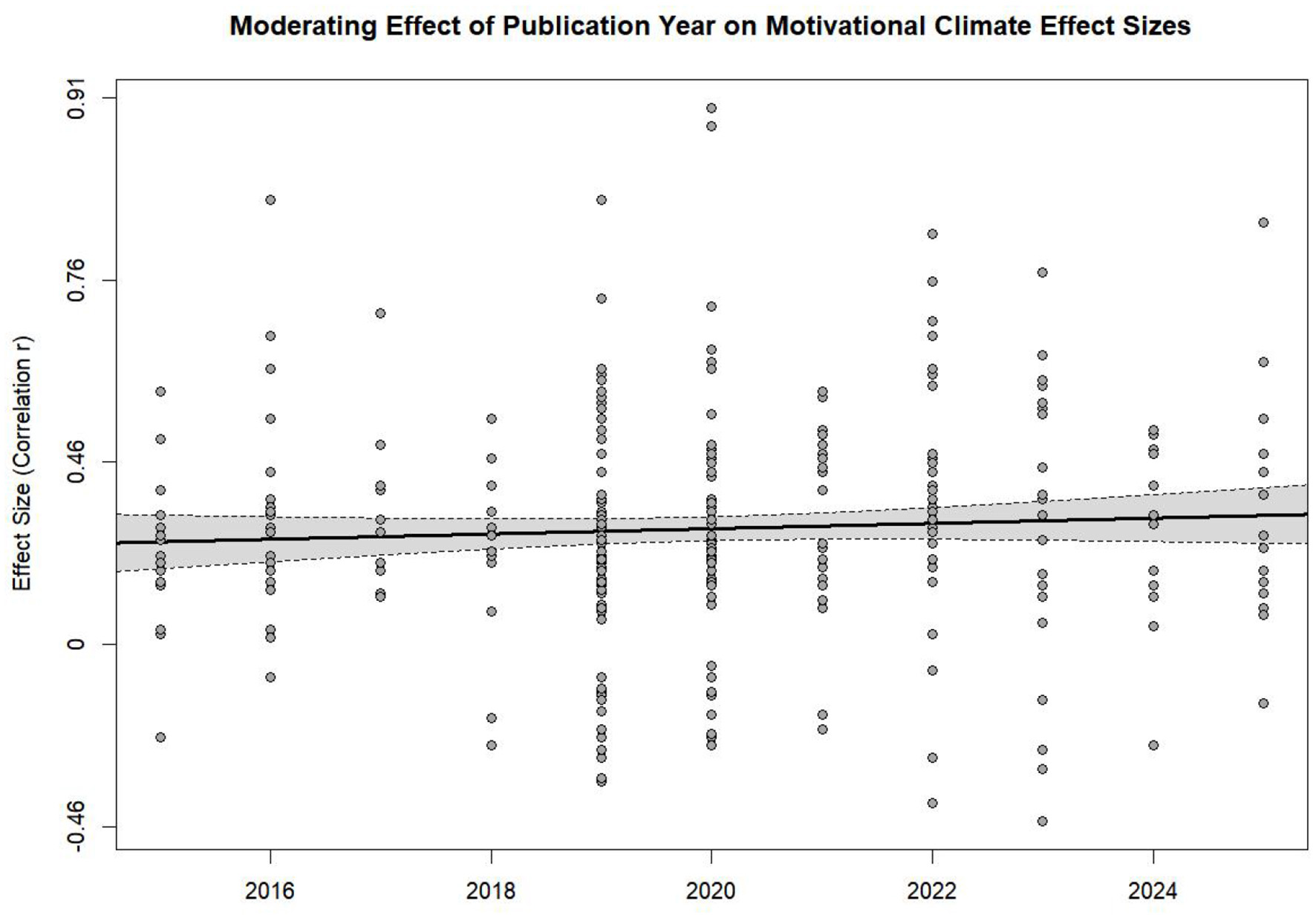 While a non-significant finding is important to note, this finding implies that there had not been simple linear trend in the relationship of motivational climate and positive outcomes over the past 10 years. More importantly, this finding suggests that the large heterogeneity in this research area is not simply explained by methodological advances or trends over time. Conversely, the findings of this meta-regression suggest that the substantive theoretical moderators, such as the hierarchical nature of the outcomes and the specific type of climate, are the main contributors to the observed variance in the literature. Thus, these findings suggest that the general findings in this area of research are relatively stable, and to understand differences across studies, one must look to deeper theoretical meanings rather than simply holding the publication year constant.