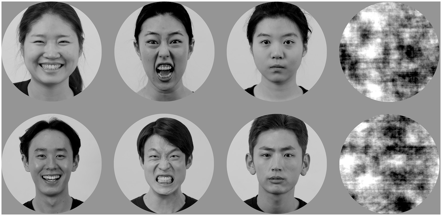 The stimuli consisted of facial pictures expressing various emotions drawn from the Yonsei Face Database (Chung et al., 2019). The pictures in this database can be considered prototypical exemplars of each emotion because the facial expressions in these pictures have been reported to be highly accurate (the percentage of correct classifications across the seven basic emotion categories was 99.02% for happiness and 86.71% for anger) and intense (5.34 for happiness and 5.37 for anger on a 7-point Likert scale). Of the 74 Korean actors in the database, each of whom had angry, happy, and neutral expressions, 72 (36 males and 36 females) were selected. The dimensions, alignment, and orientation of each face were standardized based on the position of the eyes and the tip of the nose. The images were then converted to grayscale and cropped into circular shapes. The brightness and contrast were standardized. Examples of these stimuli are shown in Figure 1.
