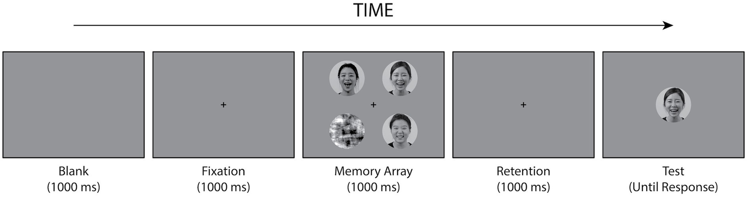 For the WM task, the stimuli consisted of 48 facial pictures: 24 actors’ happy faces and another 24 actors’ angry faces, randomly selected for each participant before the experiment. The facial pictures of the remaining 24 actors were not used in the WM task. For each trial, we randomly selected one to four pictures of actors of the same gender expressing the same emotion from the participant’s pre-selected pool of 48 faces (24 happy + 24 angry) to generate a memory array. Each facial picture was expected to appear approximately 16.67 times within memory arrays and 6.67 times as a test stimulus during the WM task, ensuring balanced exposure frequency across stimuli. In trials with fewer than four memory loads, filler images were presented at the remaining stimulus locations. The fillers were generated by scrambling the Fourier phase of the original facial stimulus. Scrambled images preserve the low-level visual properties of the original image, while disrupting its recognition by maintaining the amplitude spectrum and randomizing the phase information (LoPresti et al., 2008).