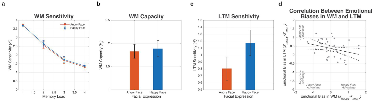 Figure 3. Results from the experiment. (a) WM sensitivity, d’, as a function of WM load and emotional valence. Error bars represent 95% confidence bounds. (b) WM capacity, kit, for negative and positive emotional expressions. (c) LTM sensitivity, d’, for different emotional valences. (d) Relationship between the happy face advantages in WM and LTM. The solid line represents the regression line, and dashed lines represent 95% confidence bounds.