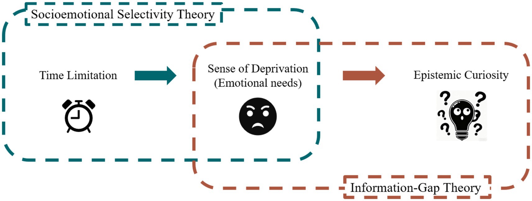 However, in daily life, time limitation may also enhance curiosity rather than suppress it. For instance, books borrowed from the library seem to attract readers more than those that have been purchased. The sole distinction between the two lies in the presence or absence of an external time limitation on reading. The socioemotional selectivity theory (SST) suggests that when individuals perceive time as limited, they are more likely to prioritize their emotional needs (Carstensen, 2006). In the preceding context, it is not the book itself that attracts individuals, but rather the unknown information it contains. This thirst for knowledge, sparked by the unknown information, is termed epistemic curiosity (Keller et al., 2024; Berlyne, 1954). According to the Information-Gap Theory of curiosity, epistemic curiosity is closely linked to negative emotional experiences arising from unknown information (Huang et al., 2021; Loewenstein, 1994). Specifically, when individuals perceive a discrepancy between what they know and what they wish to know, they experience an aversive emotional state of deprivation, which motivates them to seek information to reduce this discomfort, thus demonstrating a higher level of epistemic curiosity (Litman, 2008; Huang et al., 2021). Empirical findings support this theoretical account. Van Lieshout et al. (2021) found that participants’ curiosity increased with greater uncertainty about unknown information, even as their subjective well-being decreased. Complementing these behavioral results, neurocognitive evidence also indicates that curiosity involves dopaminergic systems associated with emotional arousal (Gruber and Ranganath, 2019). Building on these findings, it can be inferred that time limitation amplifies the sense of deprivation from unknown information through increased sensitivity to emotional needs, a mechanism explained by SST; this sense of deprivation constitutes a key negative emotional experience in the Information-Gap Theory and serves as the core driver of epistemic curiosity (Figure 1).