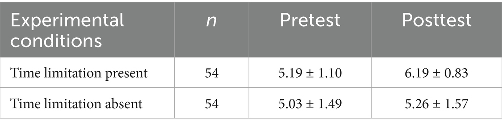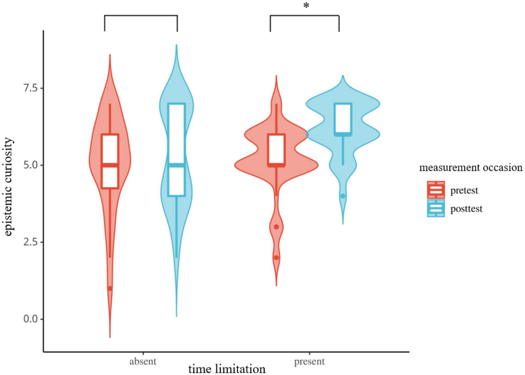 Data analysis was conducted using R 4.4.2. A mixed-design ANOVA was performed with epistemic curiosity as the dependent variable, including a between-subjects factor of time limitation (present vs. absent) and a within-subjects factor of measurement occasion (pretest vs. posttest). Prior to conducting the mixed-design ANOVA, several assumptions were examined. The dependent variable (epistemic curiosity) was treated as continuous, and the independence of observations was ensured by the experimental design. Box’s M test was used to assess the homogeneity of covariance matrices, and Levene’s test was applied to examine the homogeneity of variances. The results indicated that both assumptions were met (Box’s M, p > 0.05; Levene’s test, ps > 0.05). Given the sufficiently large sample size in each group (n > 30), the parametric analyses can be considered robust to potential deviations from normality (Blanca Mena et al., 2017). Additionally, an independent samples t-test was conducted to examine the effectiveness of the manipulation of the time limitation condition.