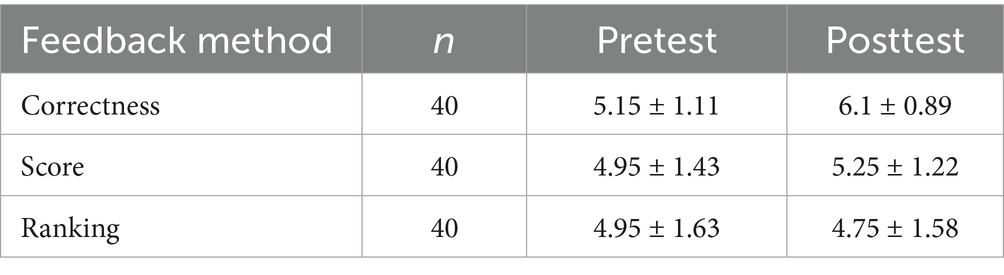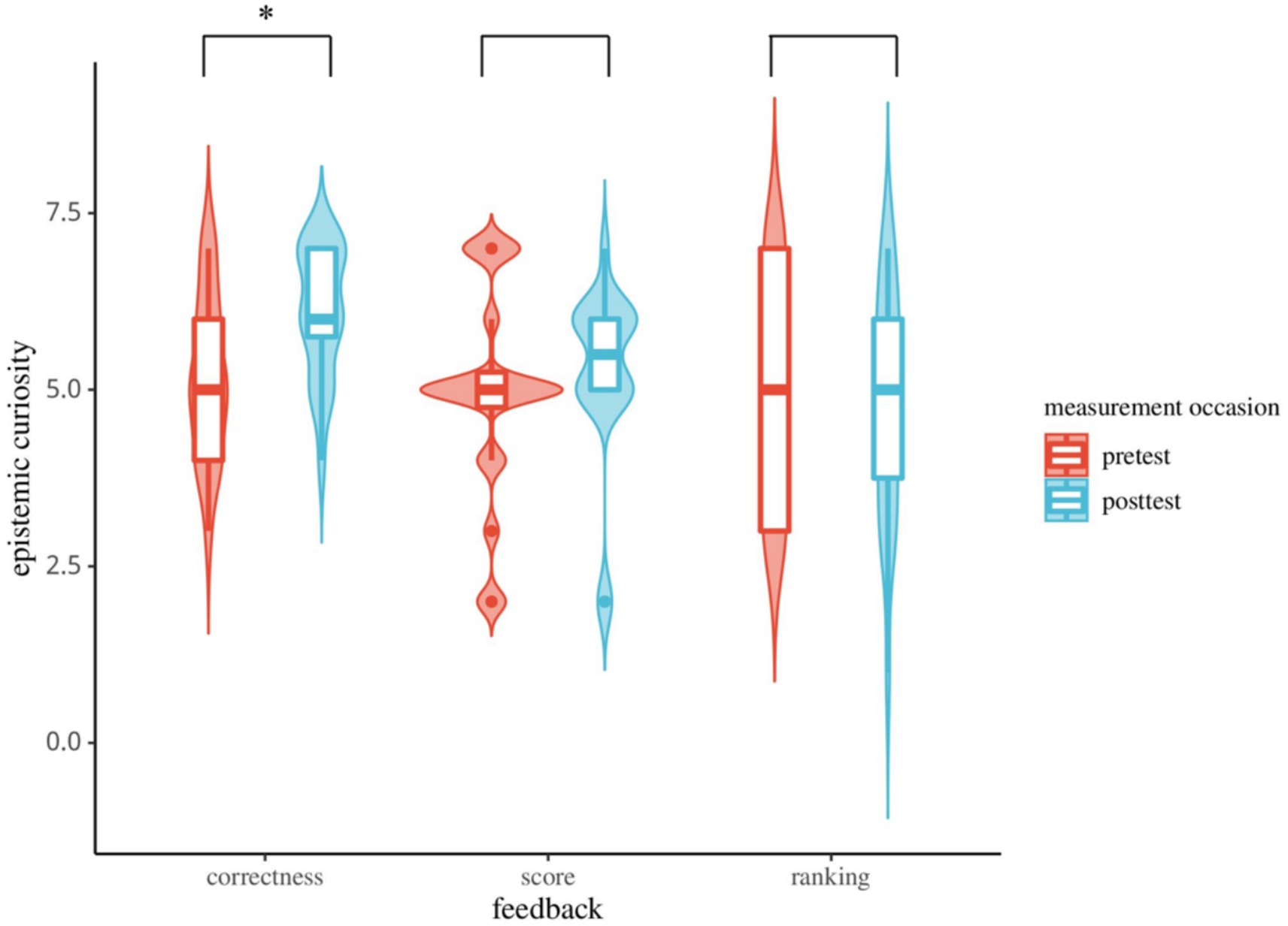 Data analysis was conducted using R 4.4.2. A mixed-design ANOVA was performed with epistemic curiosity as the dependent variable, including a between-subjects factor of feedback (correctness vs. score vs. ranking) and a within-subjects factor of measurement occasion (pretest vs. posttest). Prior to conducting the mixed-design ANOVA, several assumptions were examined. The dependent variable (epistemic curiosity) was treated as continuous, and the independence of observations was ensured by the experimental design. Box’s M test was used to assess the homogeneity of covariance matrices, and Levene’s test was applied to examine the homogeneity of variances. The results indicated that both assumptions were met (Box’s M, p > 0.05; Levene’s test, ps > 0.05). Given the sufficiently large sample size in each group (n > 30), the parametric analyses can be considered robust to potential deviations from normality (Blanca Mena et al., 2017).