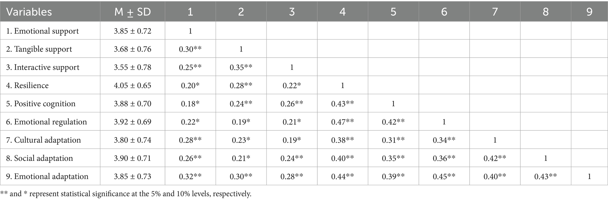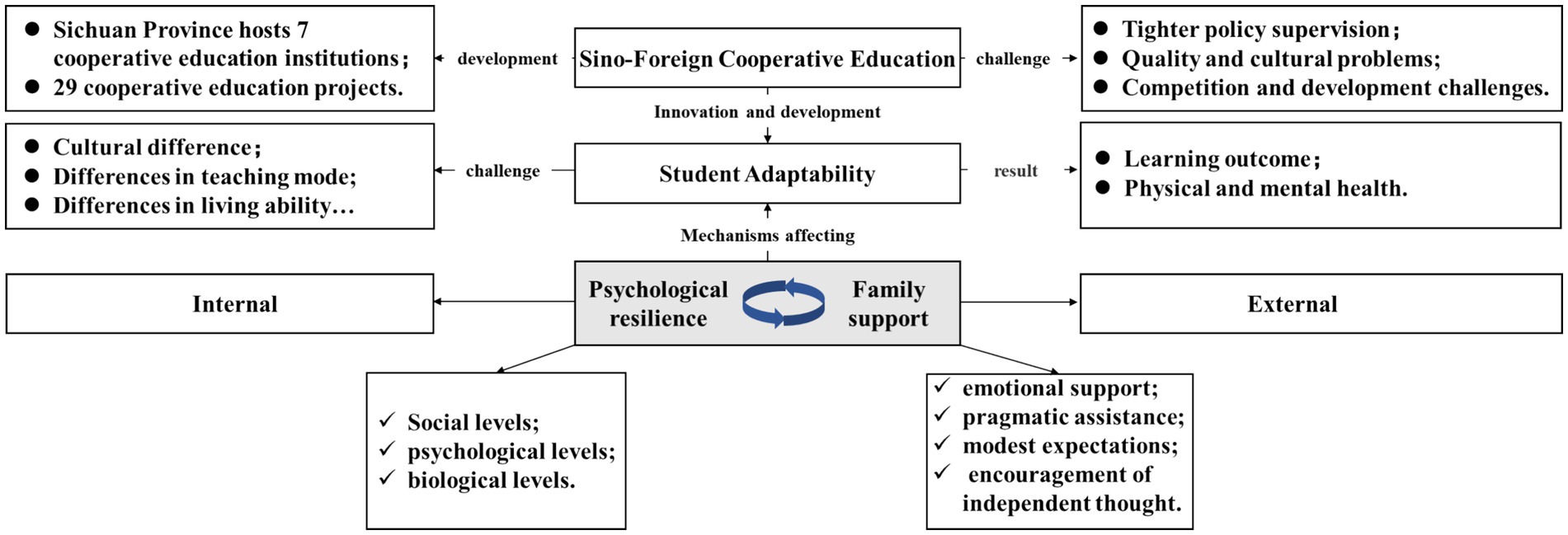 Although extensive research has been conducted on the relationship between student adaptability and factors such as family support and psychological resilience, these studies have predominantly focused on students in traditional educational settings. Relatively few investigations have examined students in Sino-foreign cooperative education programs. The existing literature primarily addresses three areas: firstly, the exploration of the basic concepts and determinants of student adaptability, offering an in-depth analysis of the development and formation of this adaptability (Argyros, 2019; García-Martínez et al., 2022); secondly, the direct impact of family support on students’ psychological wellbeing and behavior (Parker et al., 2021); and thirdly, the role of psychological resilience as a personal resource in managing stress and challenges (Shi et al., 2018; Ke et al., 2022). While these studies provide valuable insights into student adaptability, the specific mechanisms through which family support and psychological resilience influence adaptability within the context of Sino-foreign cooperative education programs remain to be elucidated.
