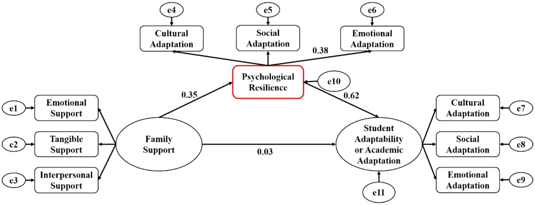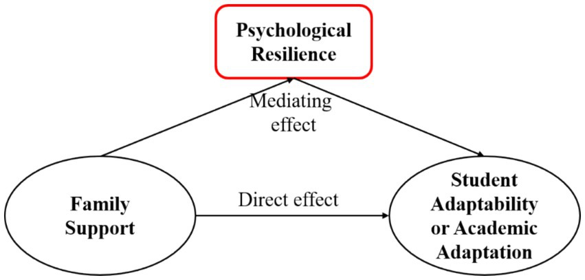In recent years, psychological resilience has emerged as a key focus in research exploring factors influencing adaptability. Extensive studies have examined the interplay between individual adaptability and psychological resilience. Denckla et al. (2020) highlighted that the concept of psychological resilience has evolved; it is no longer seen merely as a set of individual traits but also as involving dynamic interactions across various systems, impacting students’ adaptability on social, psychological, and biological levels. Franco Buitrago et al. (2023) conducted research at a Colombian university with students of differing abilities and found that psychological resilience significantly aids students in adapting to campus life, particularly when facing academic and social challenges. Najafi and Ebrahimi Belil (2023) suggested that social support and self-esteem directly enhance students’ psychological resilience, thereby improving their adaptability in managing chronic family illnesses. Mahmud et al. (2022) also discovered that family support positively influences students’ career adaptability, underscoring the strong linkage between family support and adaptability in higher education. Hirano (2020) observed that resilience varies among individuals confronted with identical stressors, influenced not only by internal traits but also by external factors such as culture and environment. Supporting this notion, Ungar et al. (2021) introduced the concept of multi-system resilience, emphasizing that psychological resilience, when integrated with other factors like environment and social support, effectively enhances individual adaptability. These findings reveal a complex interrelation between family support and psychological resilience, collectively shaping students’ adaptability. It is evident that family support can facilitate adaptability through psychological resilience, and in turn, psychological resilience is shaped by family support.