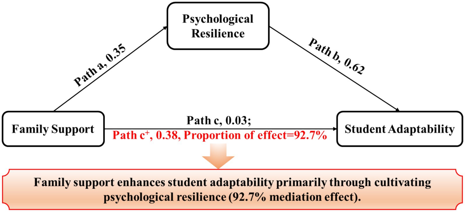 Figure 4. The mediation effect of psychological resilience between family support and student adaptability. Path a, the effect of family support on psychological resilience; Path b, the effect of psychological resilience on student adaptability; Path c, the direct effect of family support on student adaptability; Path c+, the indirect effect of family support on student adaptability when psychological resilience as the mediator.