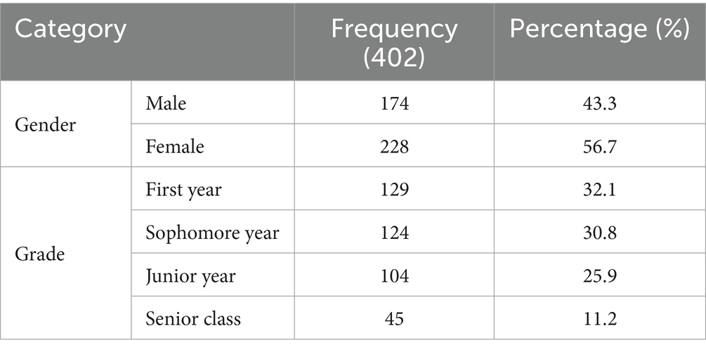 This study employed cluster sampling to select 450 undergraduate students from eight Sino-foreign cooperative education programs in Chengdu, Sichuan Province, as survey participants. A total of 450 questionnaires were distributed, of which 440 were returned, resulting in 402 valid responses, yielding a response rate of 91.4%. The mean age of the sample was 20.67 ± 2.81 years. Table 1 represents the respondents’ demographic profile.