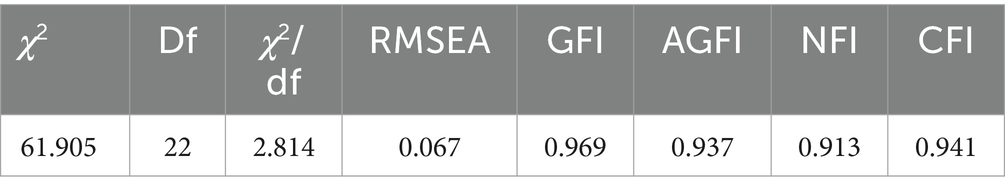 Correlation analysis from Table 2 reveals significant relationships among family support, psychological resilience, and student adaptability within the context of Chengdu’s Sino-foreign cooperative education programs. However, the specific processes and predictive effects of these relationships warrant further exploration. This study introduces Hypothesis H3, positing that psychological resilience fully mediates the relationship between family support and student adaptability. To substantiate this hypothesis, a structural equation model is employed to rigorously analyze the interrelations among family support, psychological resilience, and student adaptability, drawing on the aforementioned correlation analysis. This model was developed using Amos 24.0, and path analysis was performed to scrutinize its functional mechanisms. The model presented in this study is depicted in Figure 3, with the fit indices for the model displayed in Table 3. The results presented in Table 3 indicate that the model developed in this study exhibits satisfactory fit indices and meets the established criteria for acceptance.