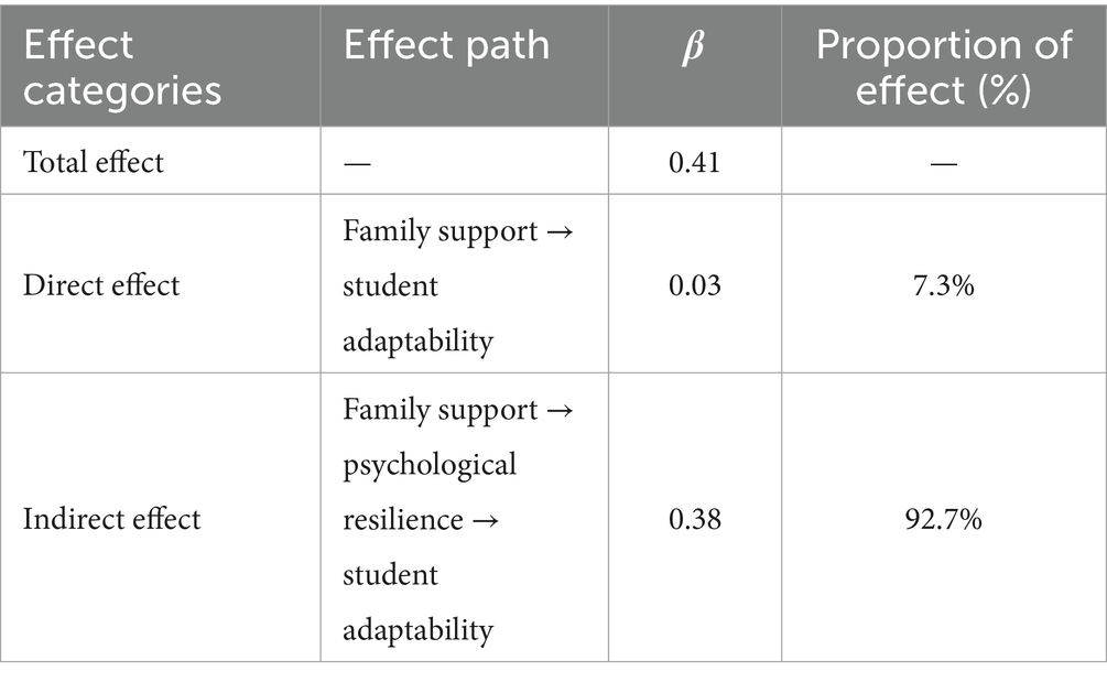 In summary, family support significantly influences both students’ psychological resilience and their direct adaptability. Psychological resilience serves as a crucial internal resource, enabling students to effectively manage environmental changes. Consequently, enhancing family support and psychological resilience represents a strategic approach to improving students’ adaptability.