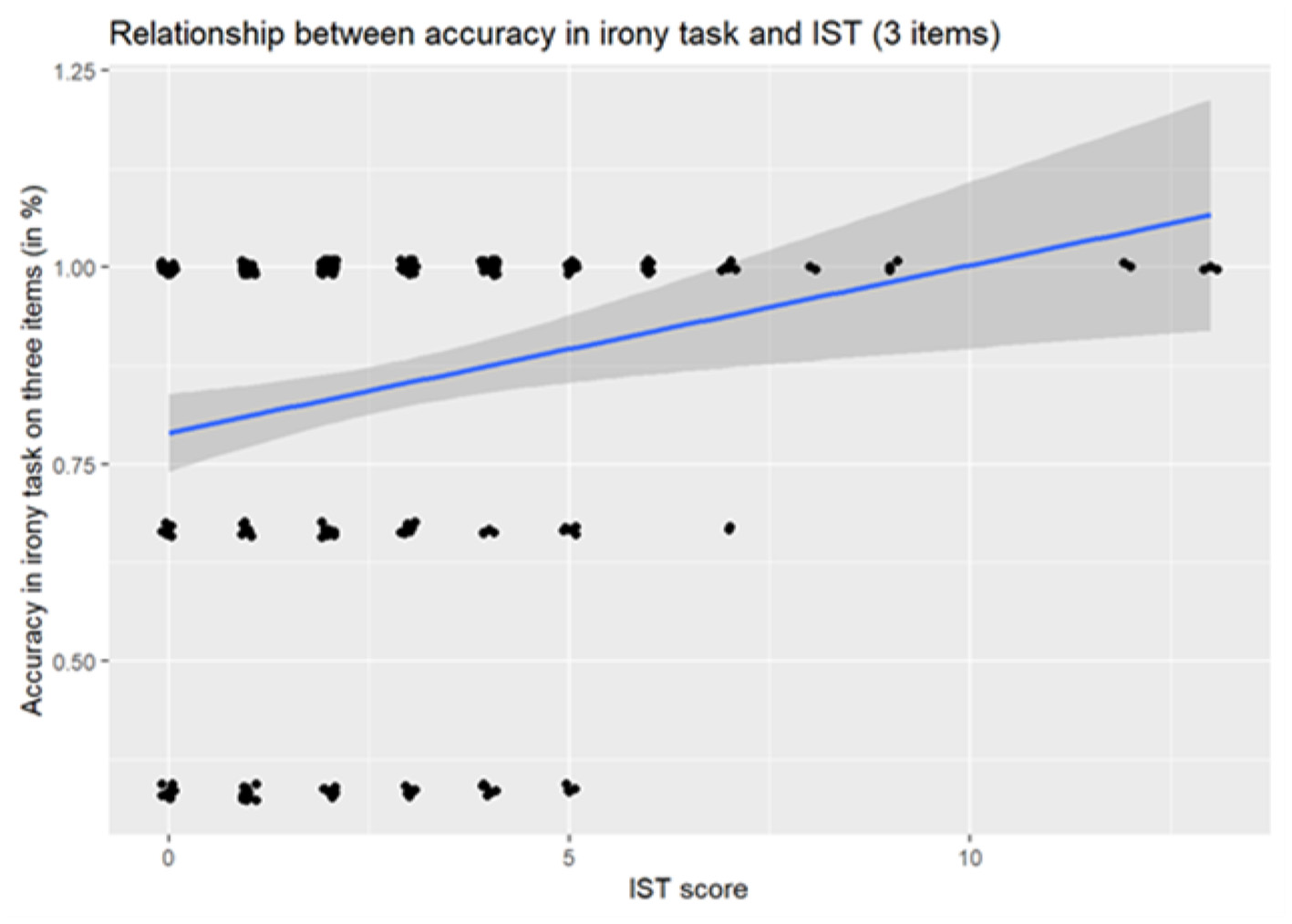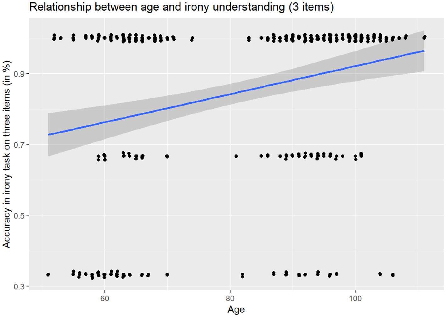 For the three irony-specific items, the null model showed a strong and significant effect of age [β = 4.52, OR = 4.52, 95% CI [2.03, 10.07], p < 0.001], see Figure 1. Sex was again non-significant (OR = 1.51, p = 0.477).