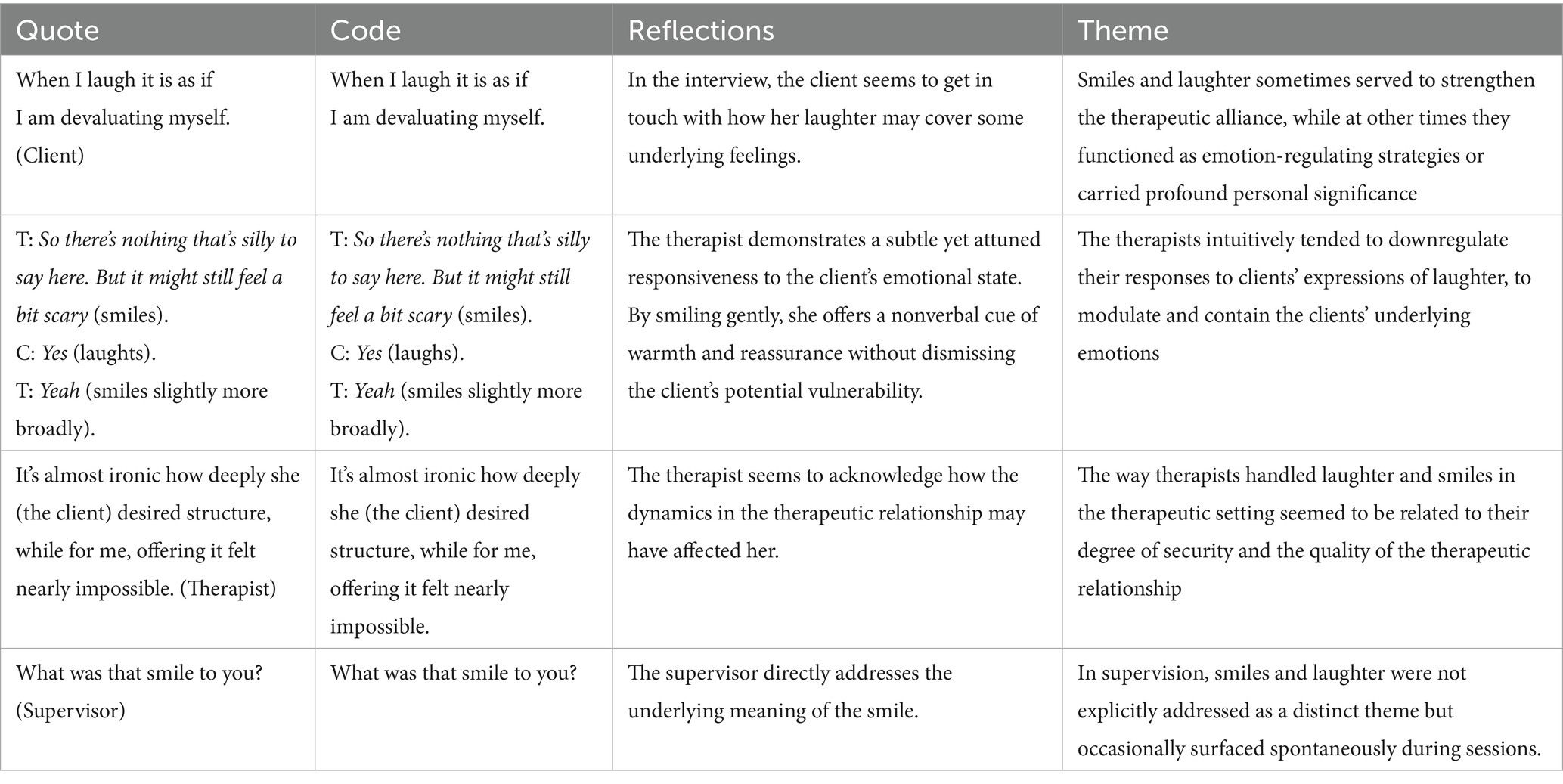 IPR interviews were conducted using selected video excerpts to evoke participant reflections on relevant therapeutic moments (Elliot, 1986; Meekums et al., 2016). For each interview, the first author prepared 4–6 therapy and 2–4 supervision excerpts. Clients only viewed therapy segments. The interviews followed a semi-structured guide (see Supplementary Material), beginning with open-ended questions before gradually directing attention to the nonverbal dimensions of the selected material. As the interviews were originally prepared for a study of nonverbal relational competence in general, the interview guides did not include questions about smiles and laughter. However, when observing the video recorded material, the interviewer became aware of and interested in how smiles and laughter were expressed in the therapy sessions, and in the interviews later, she asked questions about this when considered relevant. When participants did not spontaneously reflect on nonverbal aspects, the interviewer employed gentle, reflective probing. These interventions were informed by clinical experience and aimed at fostering awareness rather than steering interpretation. The goal was to support participants in discovering their own meaning-making processes, while maintaining their agency and sense of ownership over the narrative.